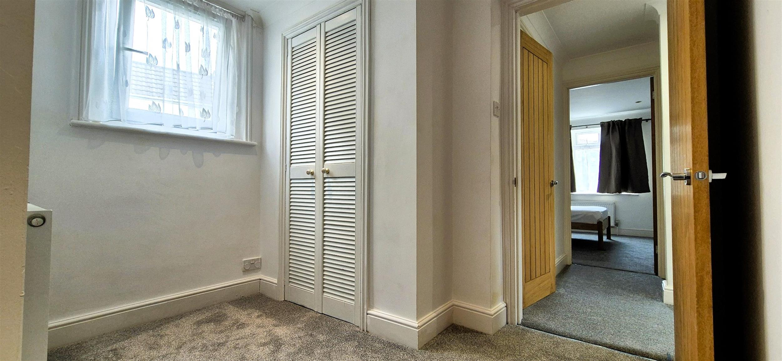 Hallway leading to bedroom one, bedroom two, bathroom and cupboard.