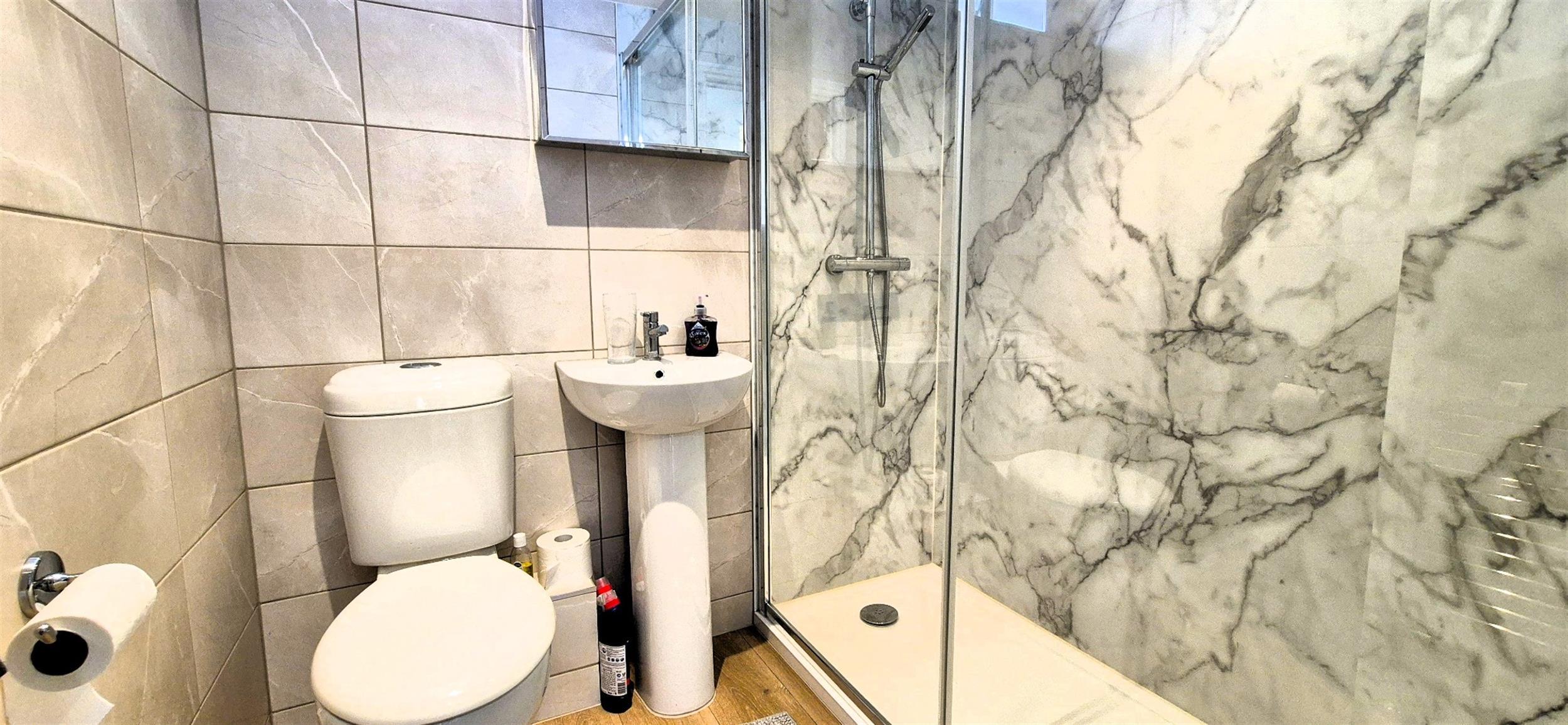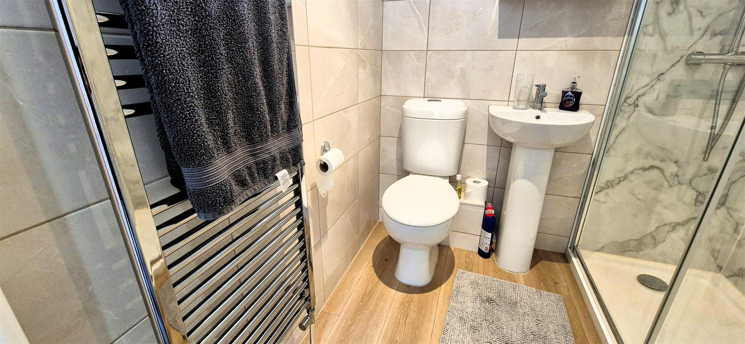 Room with toilet, sink, towel radiator, mirror unit and walk-in shower.