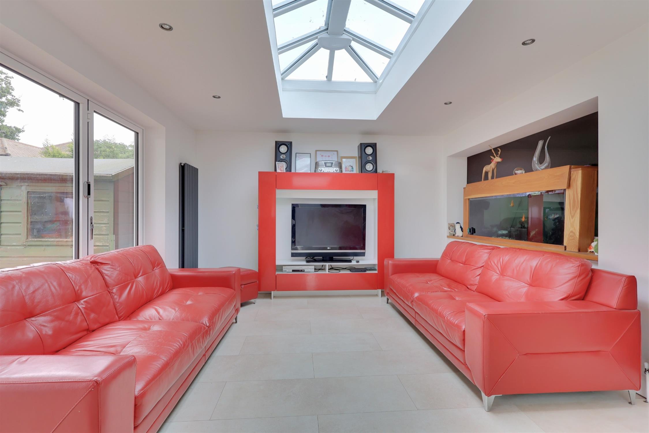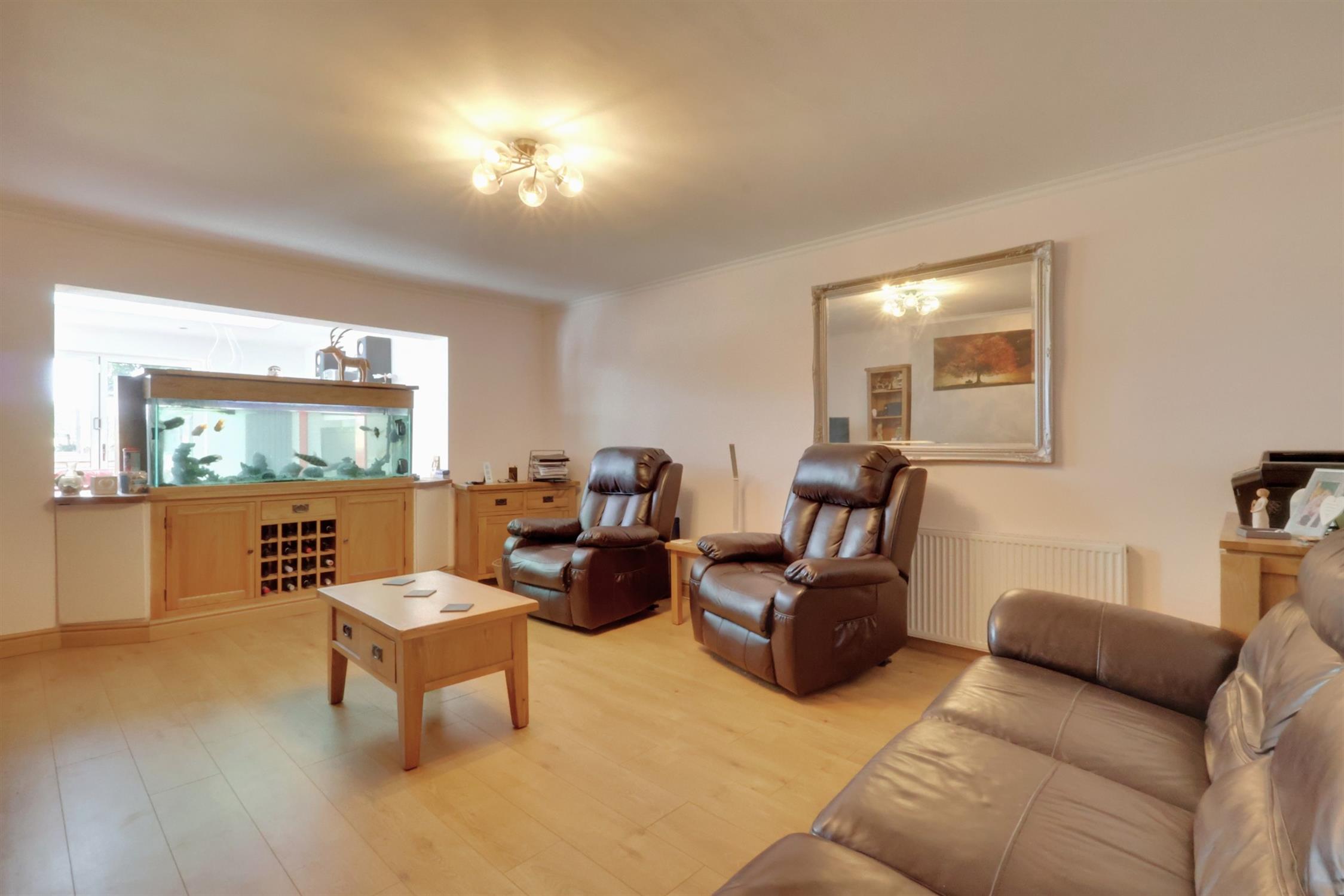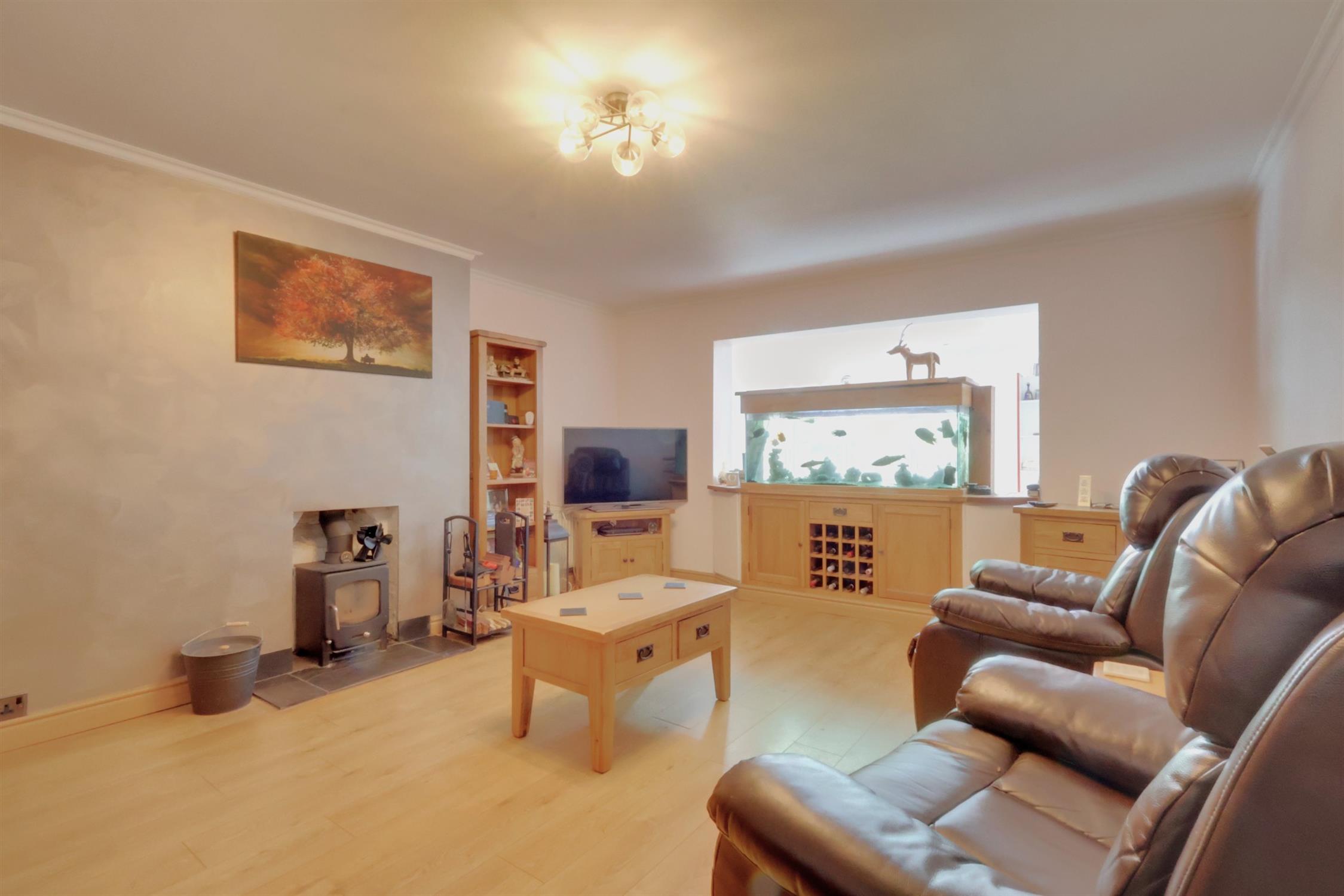 Smooth plastered and coved ceiling with central ceiling light. Light Oak style laminate flooring. Log burner with tiled hearth. Built in glass fish tank and storage cabinet set in between archway to the extended kitchen breakfast room. Radiator.
