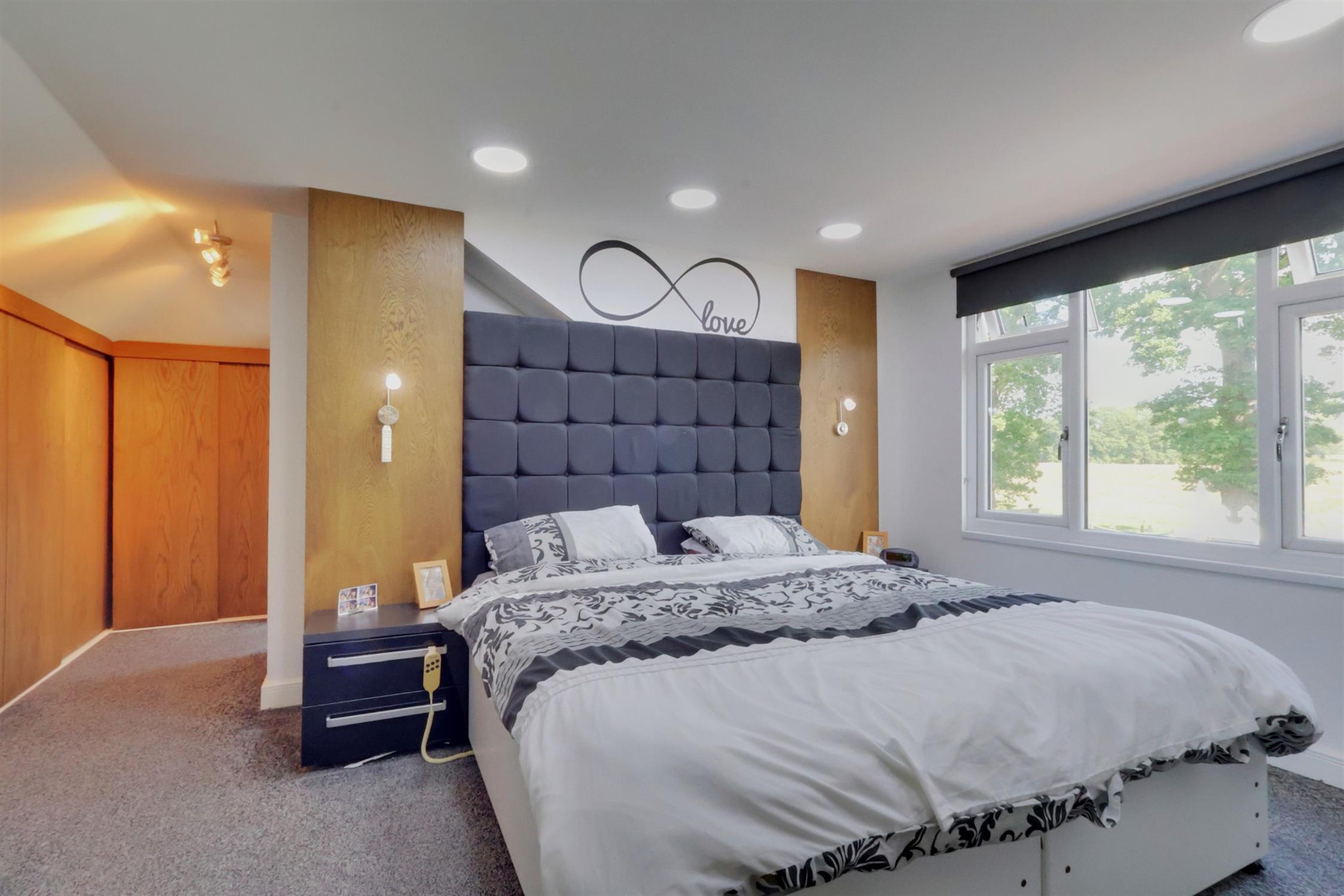 UPVC window to rear aspect enjoying views of the garden and fields beyond. Smooth plastered ceiling with inset lighting. Wall panelling with fitted lights. Built in wardrobe storage space with sliding wooden doors in dressing area, leading to en suite. Radiator.