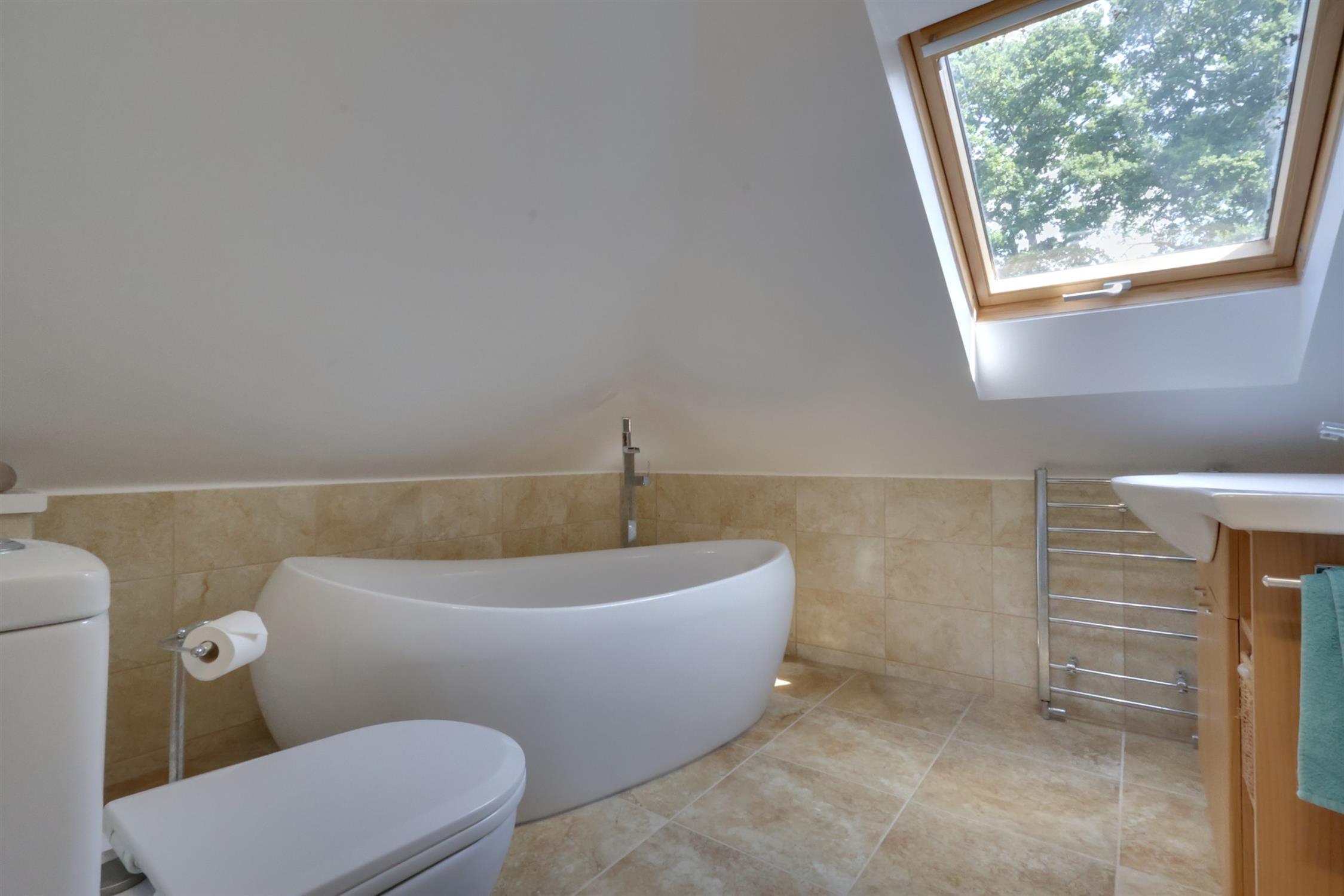 Restricted height sloping ceiling with Velux style window. Suite comprises: free standing oval shaped bath, with external waterfall style mixer tap, close coupled WC and hand basin set in vanity unit with storage under. Ladder style heated towel rail. Separate shower cubicle with glass door and wall mounted controls, tiled walls and flooring.