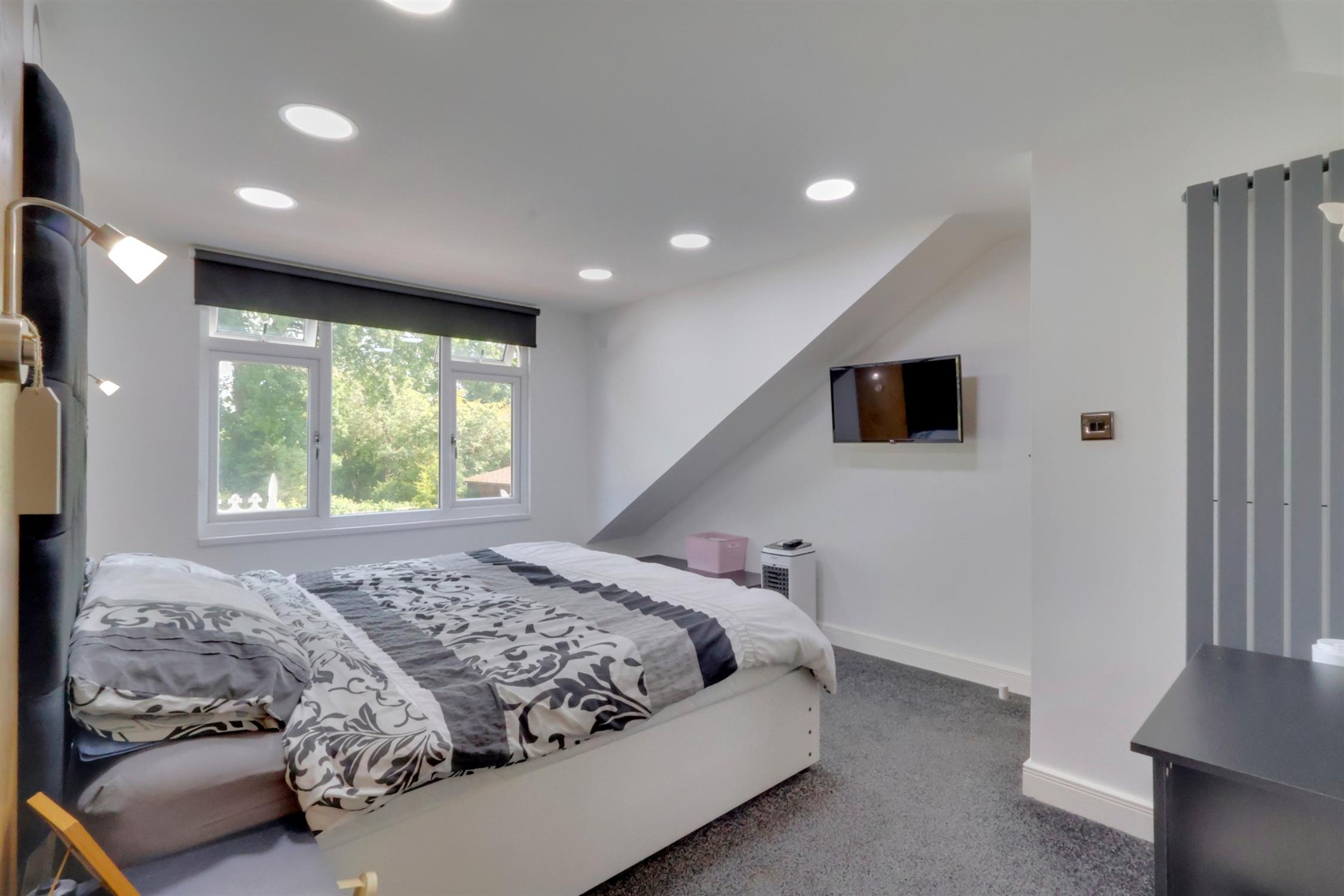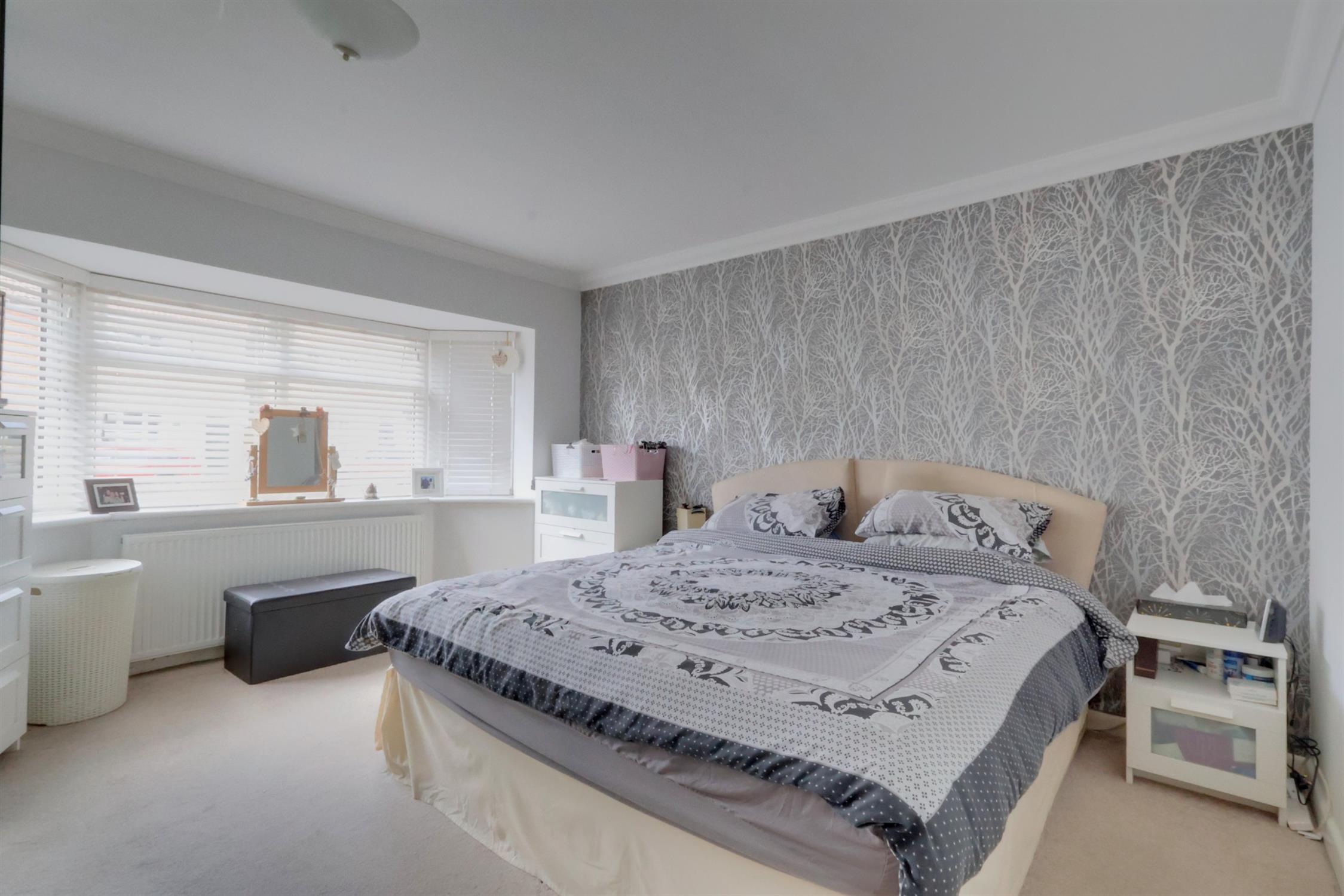 UPVC bay window to front aspect. Smooth plastered and coved ceiling. Fitted wardrobes, built in, mirror fronted storage cupboard. Radiator.
