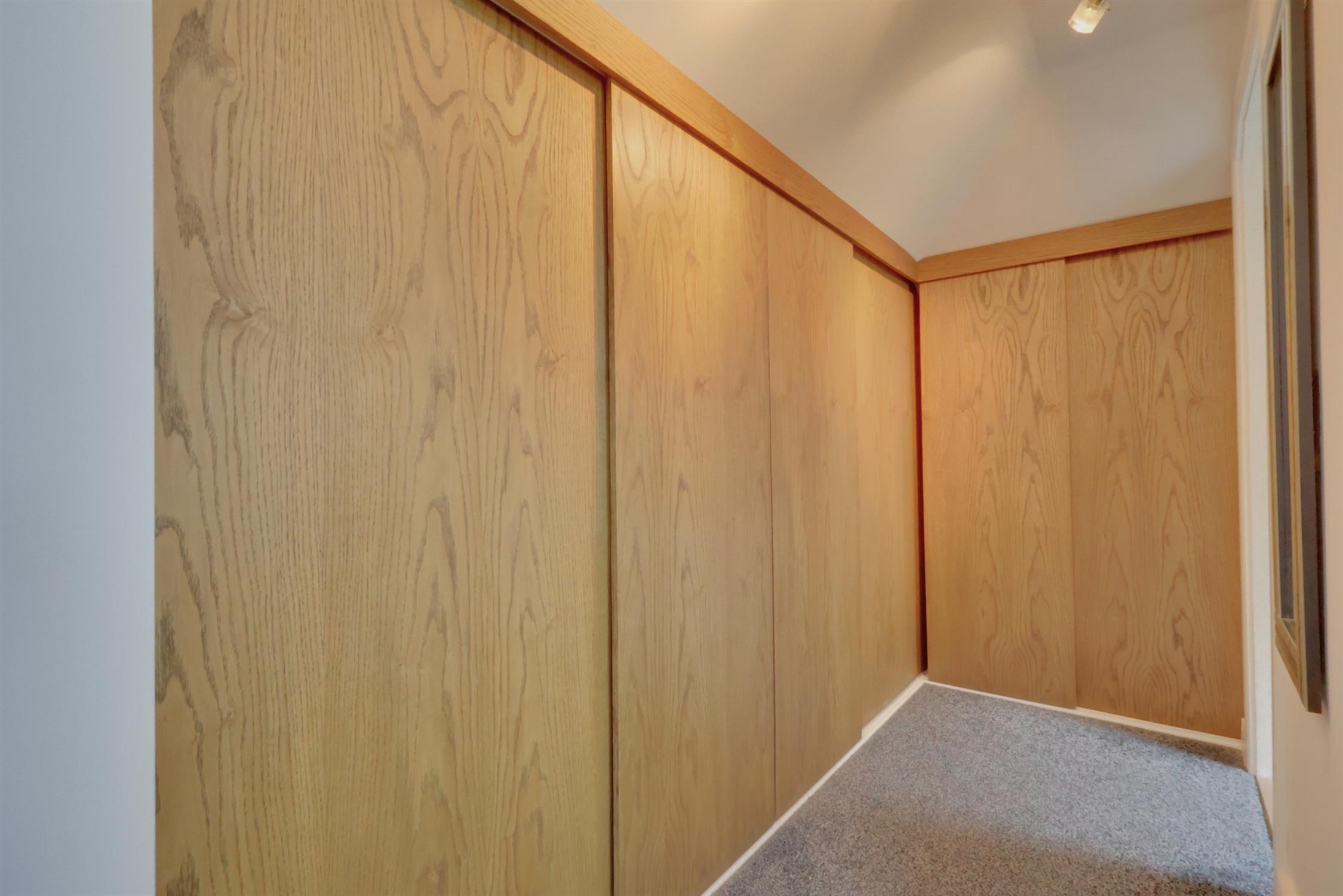 Accessed from the hardstanding driveway via a composite front door, into hallway with laminate flooring, radiator and staircase leading to first floor. To the right of the stairs are eaves storage units with patterned glass sliding doors. Radiator.