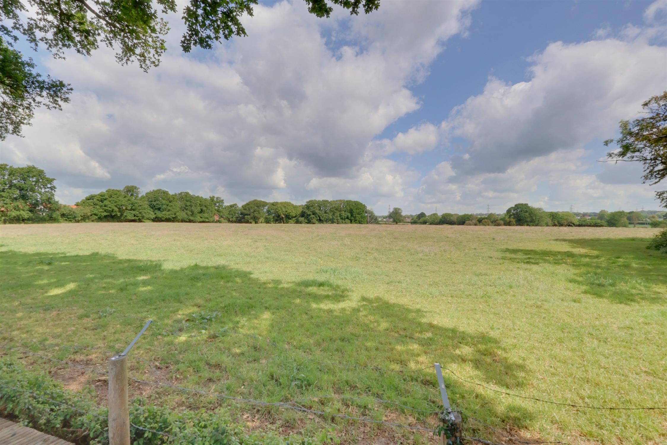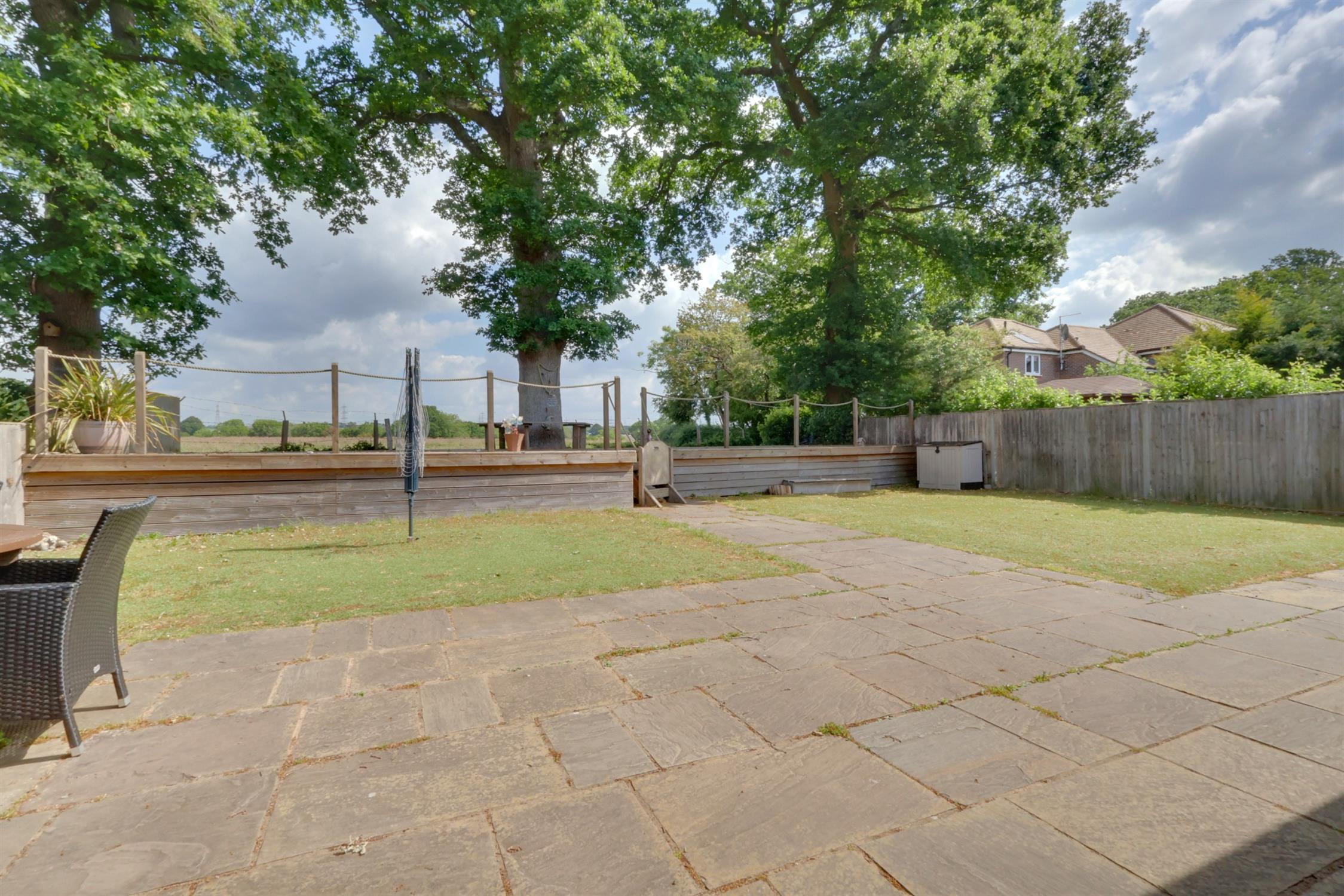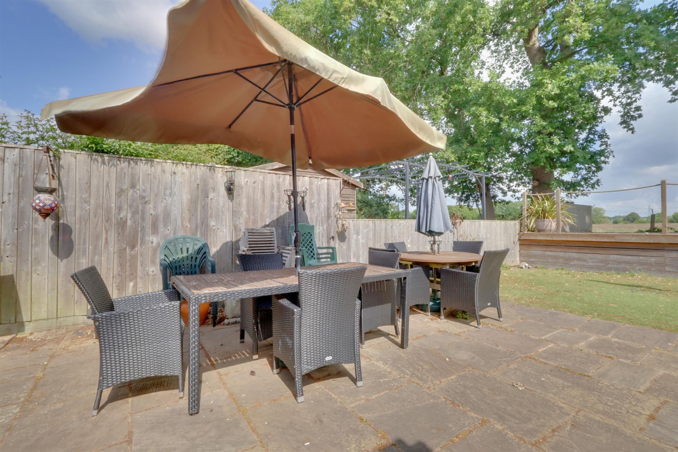 Large paved patio area with timber shed. Lawn with paved path leading to raised decked area, enjoying views over open fields.