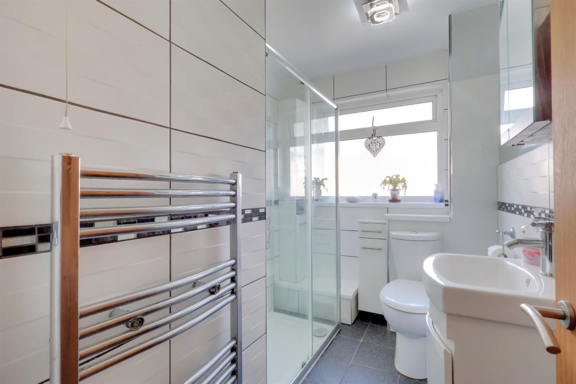 UPVC frosted window to side aspect. Central ceiling light. Suite comprises: large shower with glass screen with wall mounted controls, tiled walls and flooring, close coupled WC, hand basin set in storage unit, tiled splash back and wall mounted, ladder style heated towel rail.