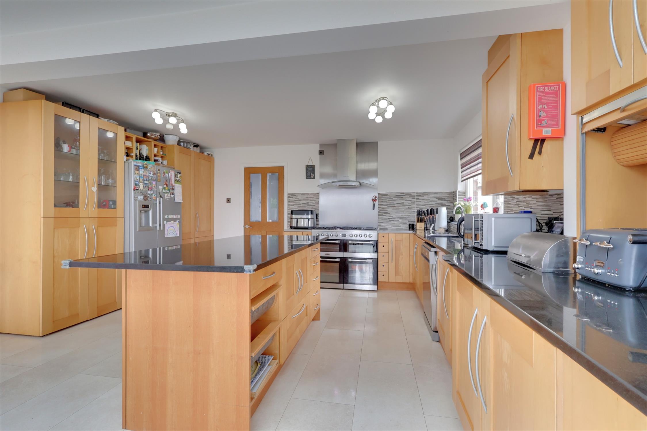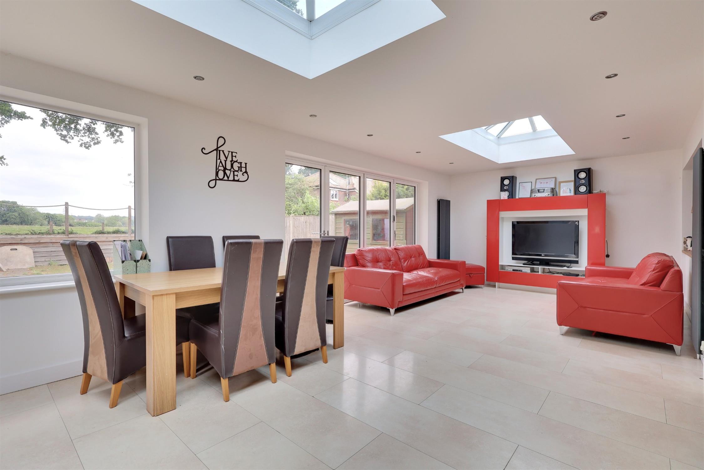 Smooth plastered ceiling with inset lighting. Two lantern style roof lights. UPVC window to side aspect and bi fold doors and window to rear aspect. Modern kitchen comprises Oak style, wall, floor and drawer units, with contrasting dark granite work surface. Central Island with matching units and granite work surface. Space for range style gas cooker with stainless steel splash back and extractor hood above. Space for American style fridge freezer. Stainless steel sink inset into granite work surface, with tiled splash back. Tiled flooring. Built in media unit incorporating TV and electric points.