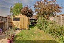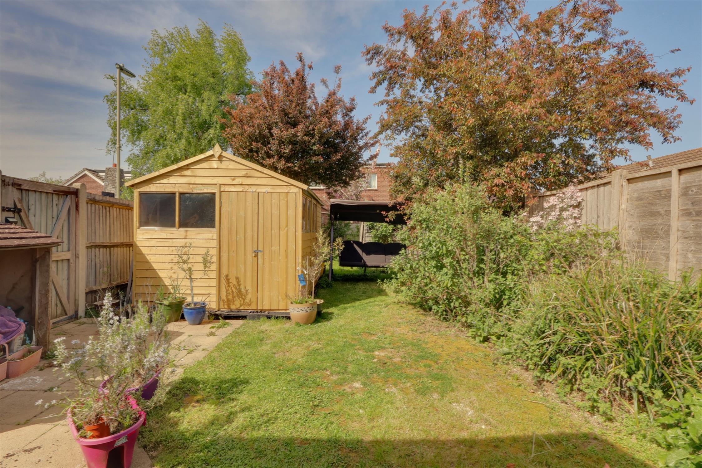 Laid to lawn and features two sheds, mature shrubs and borders, and a gate to the side alleyway.