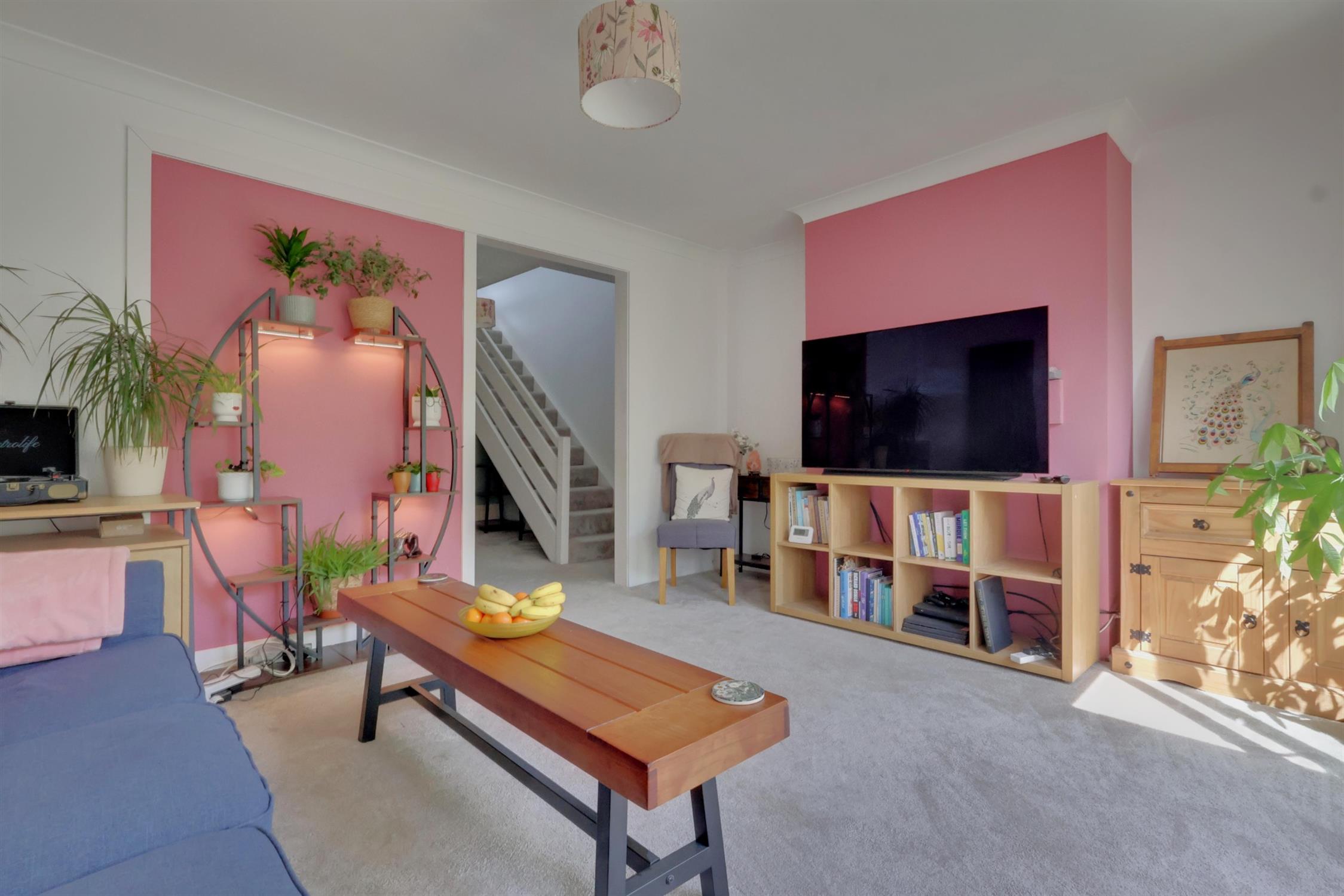 Double glazed window to the front elevation, boarded fireplace, double glazed patio doors opening onto the south-facing front garden, a vertical ceramic radiator, and an open-plan aspect through to the hall.
