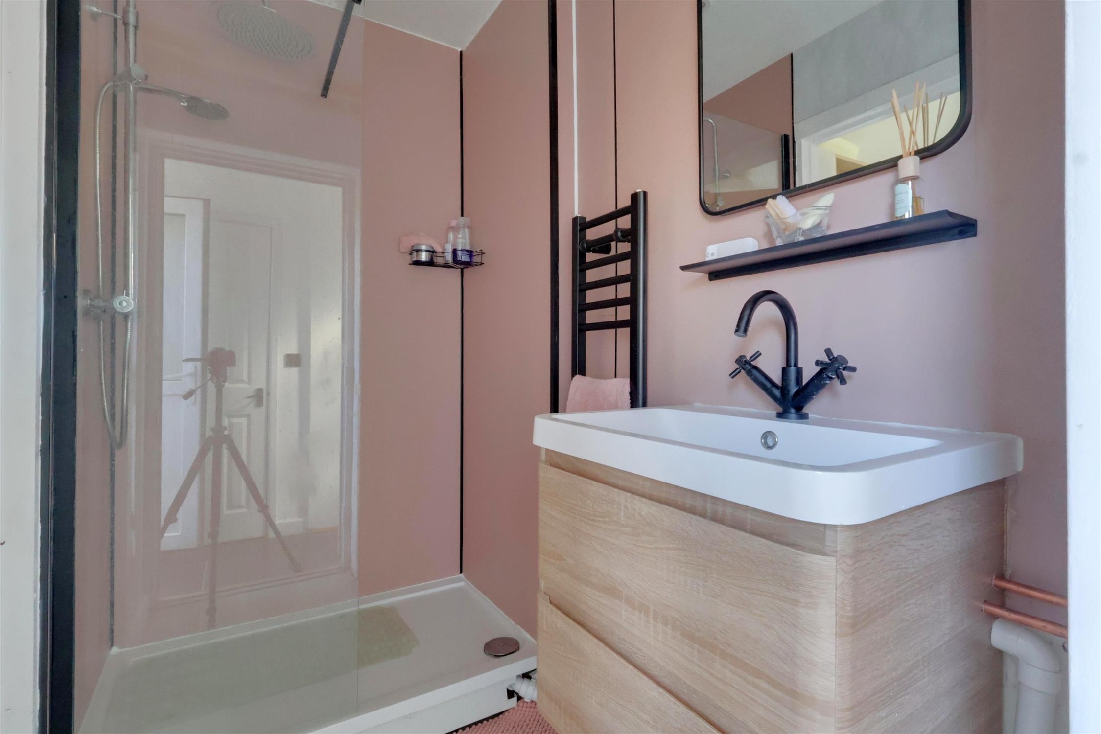 Fitted with a double shower, wash hand basin, and extractor fan, along with a separate cloakroom with obscure glazed window to the rear elevation, ladder radiator, low-level WC, tiled splashback, and wall-mounted sink.