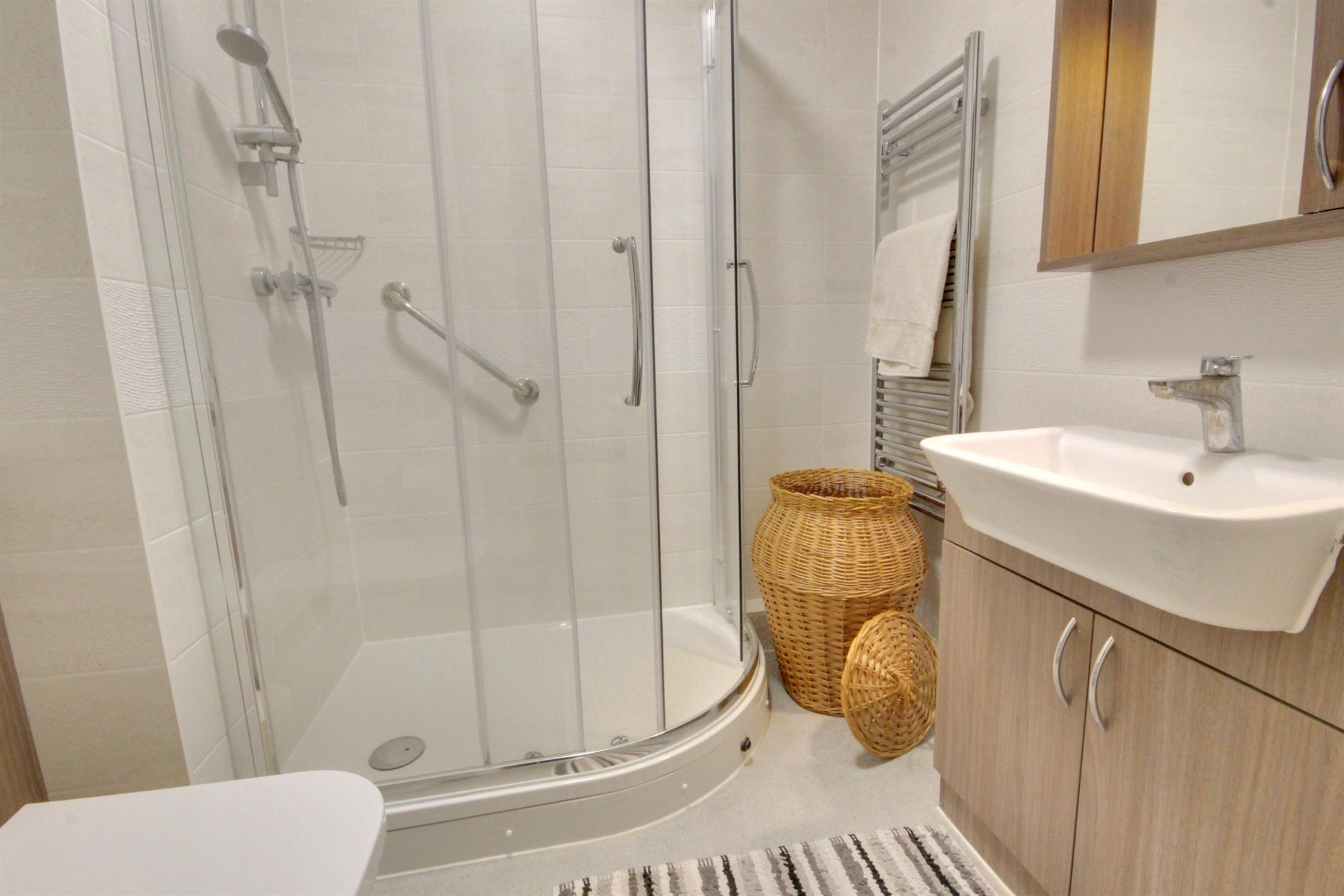 Shower RoomLarge corner shower cubicle, concealed flush WC, wash basin in vanity unit with storage, heated towel rail, tiled walls, emergency assistance alarm button.