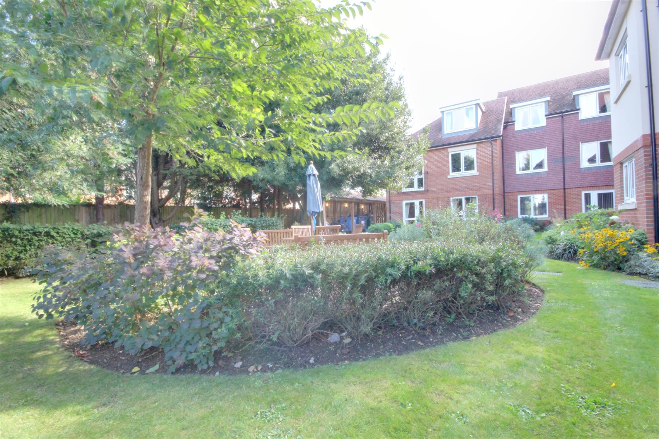 Residents lounge and kitchen for social events and gatherings with nearby onsite daytime managers office, guest suites available, attractive lawned gardens with shrubs and central patio seating area, parking for guests and residents to the front.