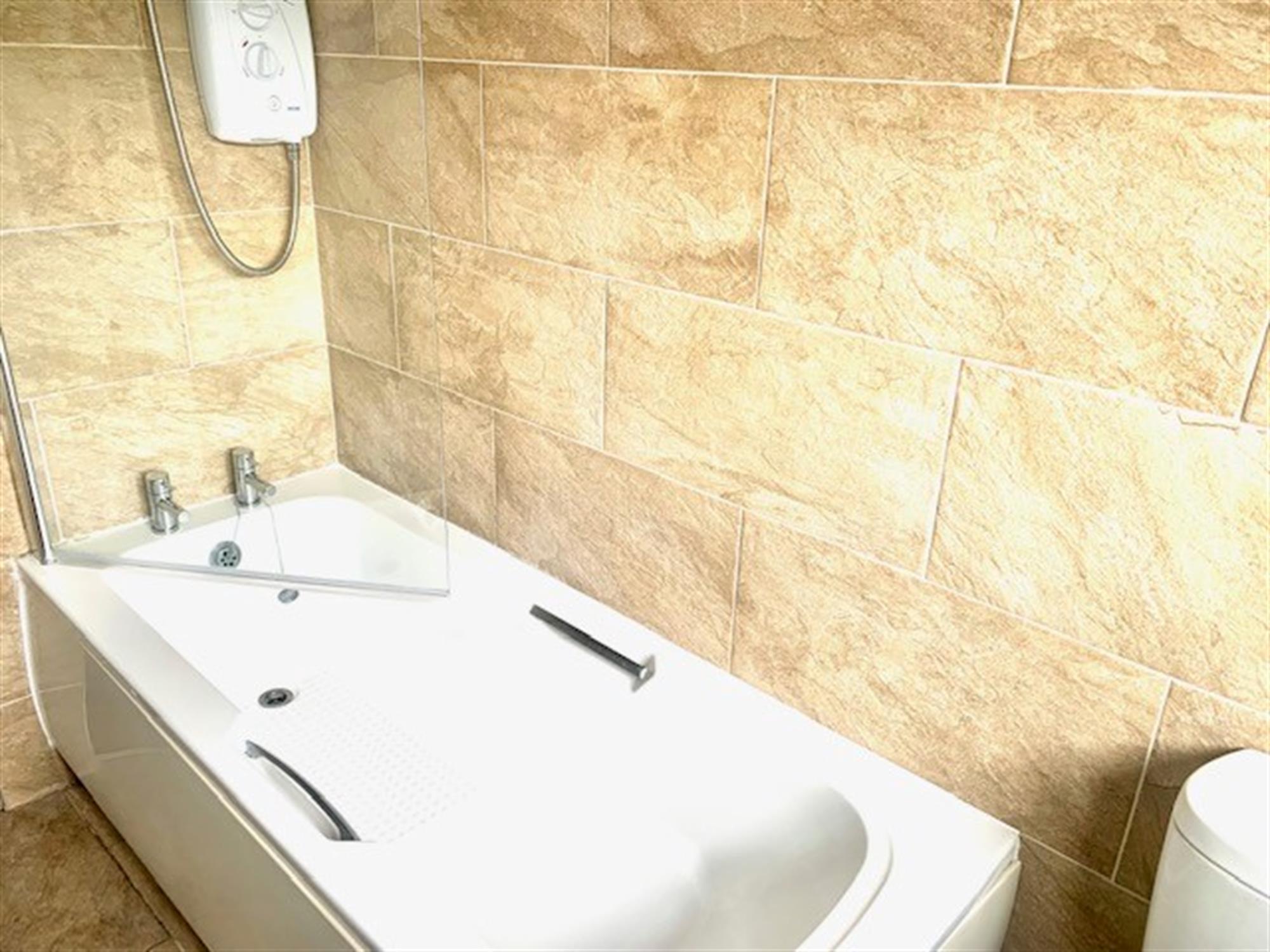 White suite bathroom with electric shower over bath, tilet and sink. Window to side.