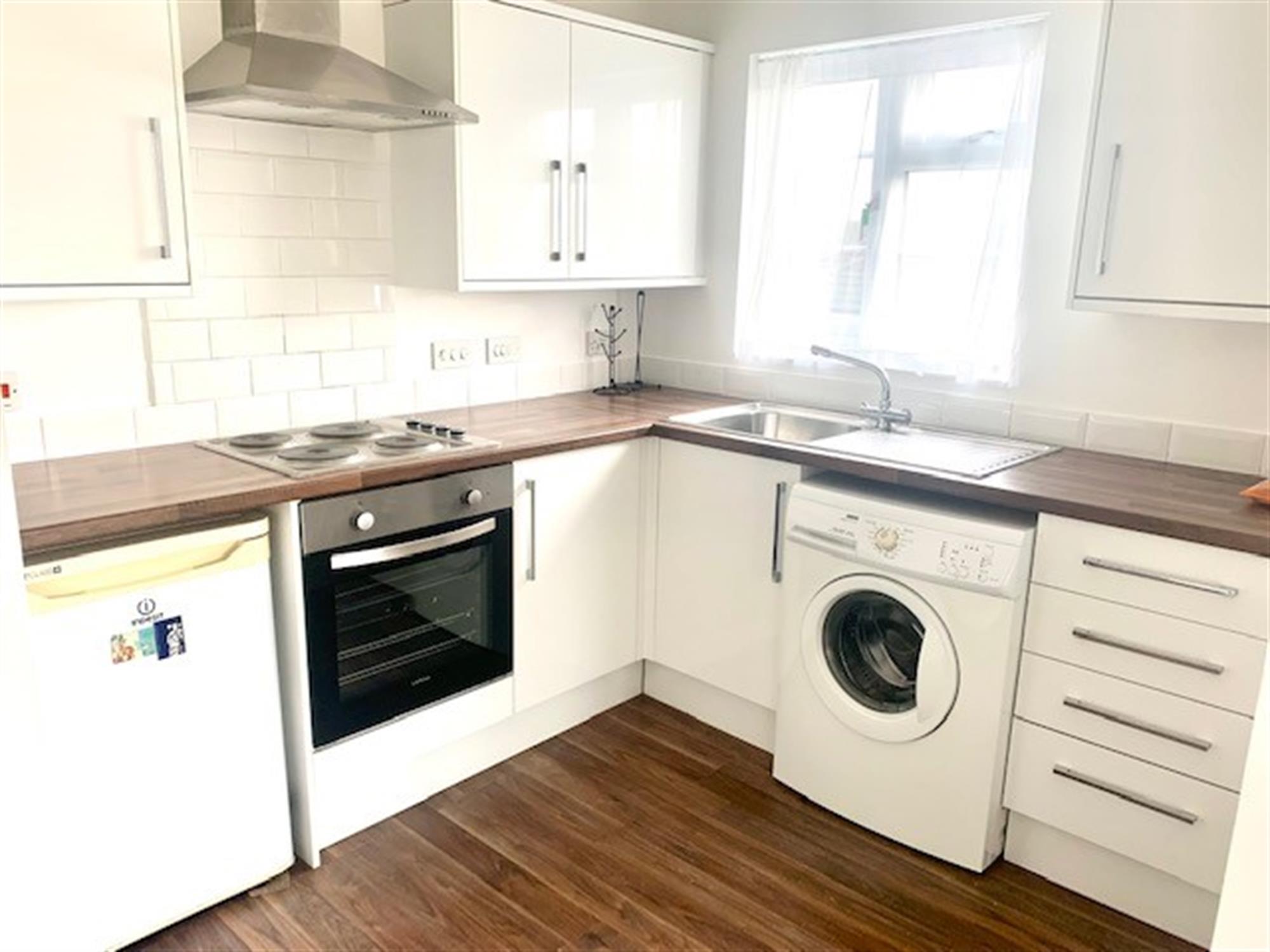 Appliances consist of: electric hob, electric oven, washing machine and fridge with small freezer box. Laminate flooring. Window to side. Openplan to lounge.
