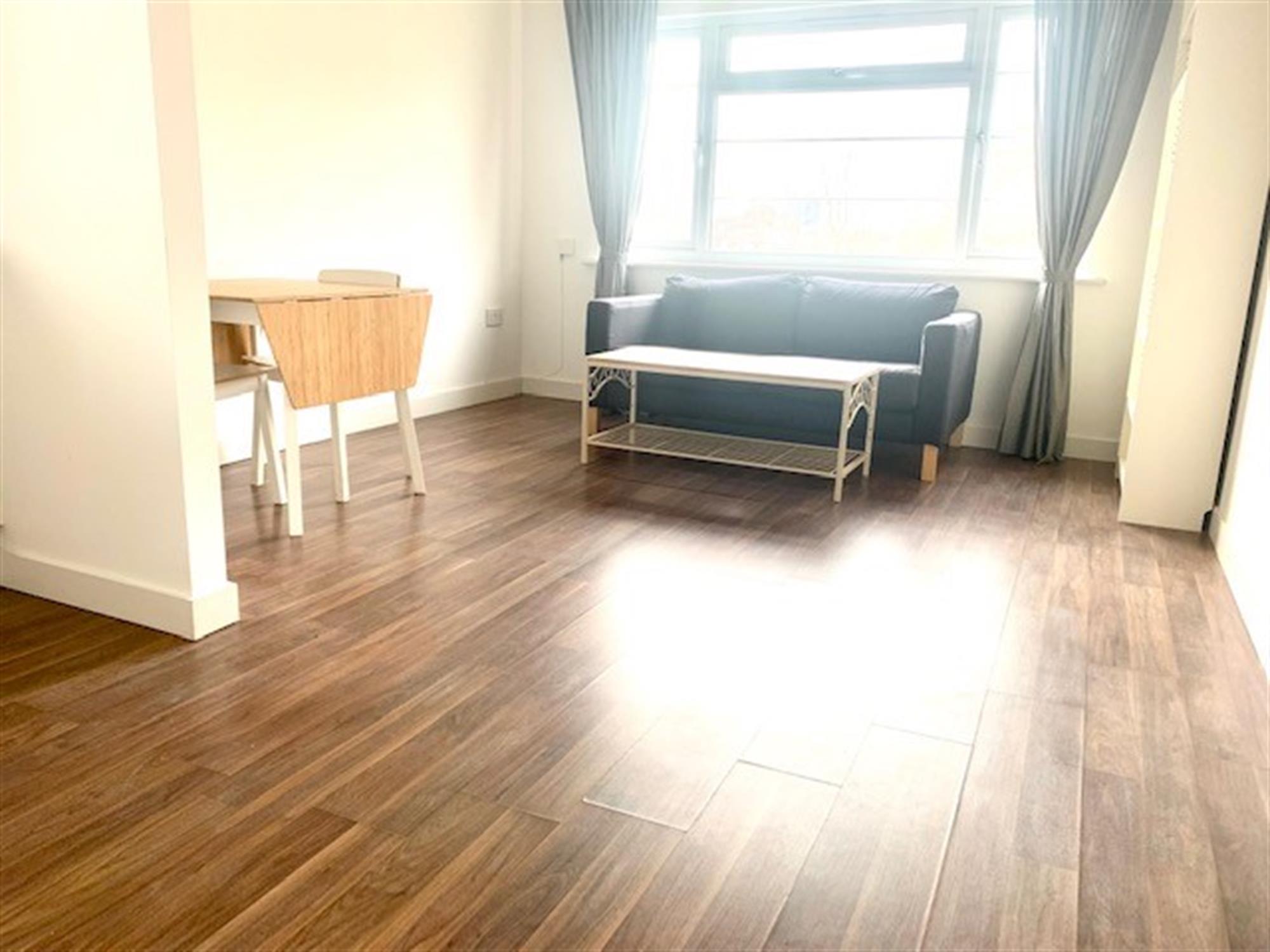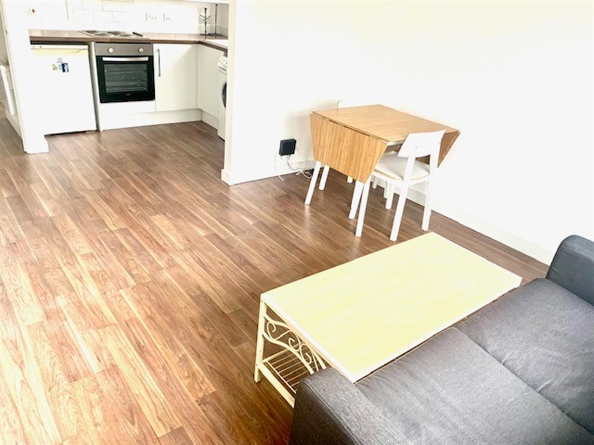 Laminate flooring. Window overlooking communal garden. Furniture consists of: 2 seater sofa, bookcase, table and chairs.