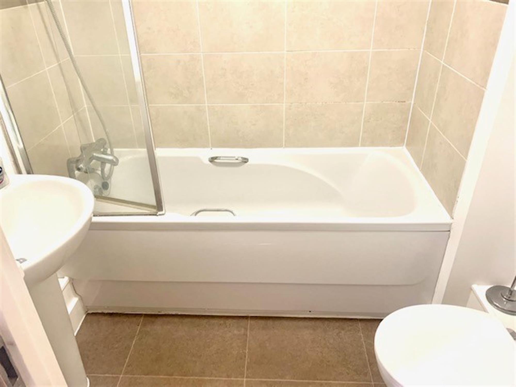 BATHROOM - White suite with bath with shower over, sink and toilet.