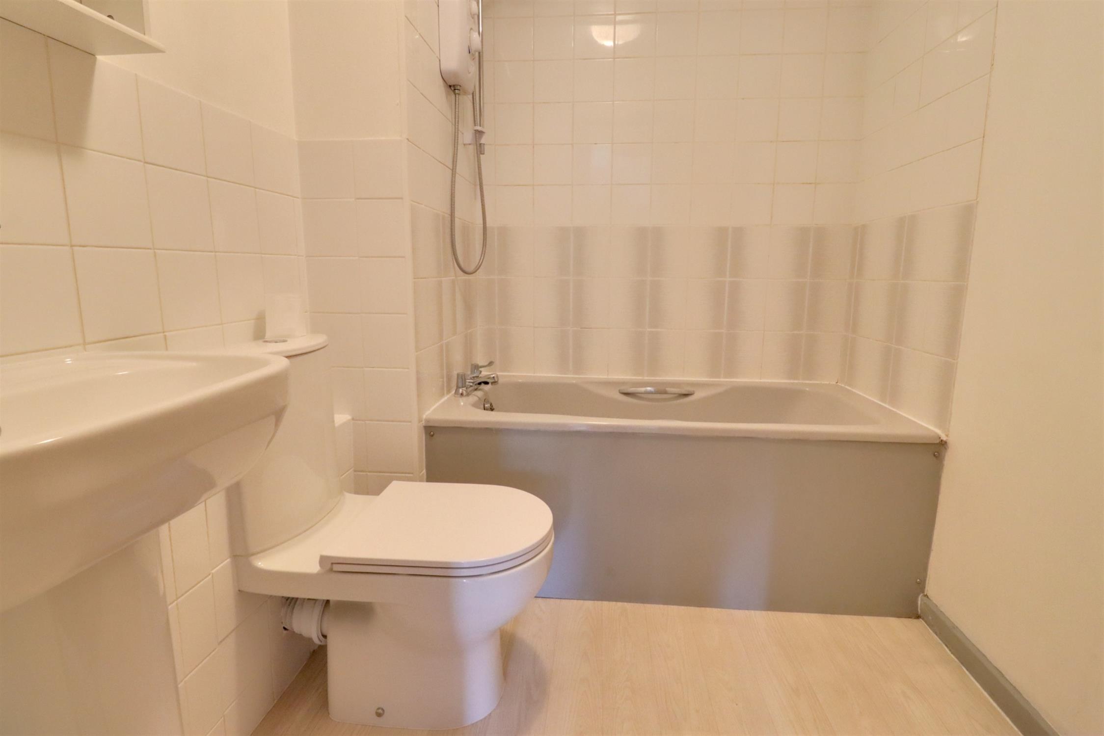 Panel enclosed bath with power shower over, low level wc, pedestal hand basin, wall mounted electric fan heater.