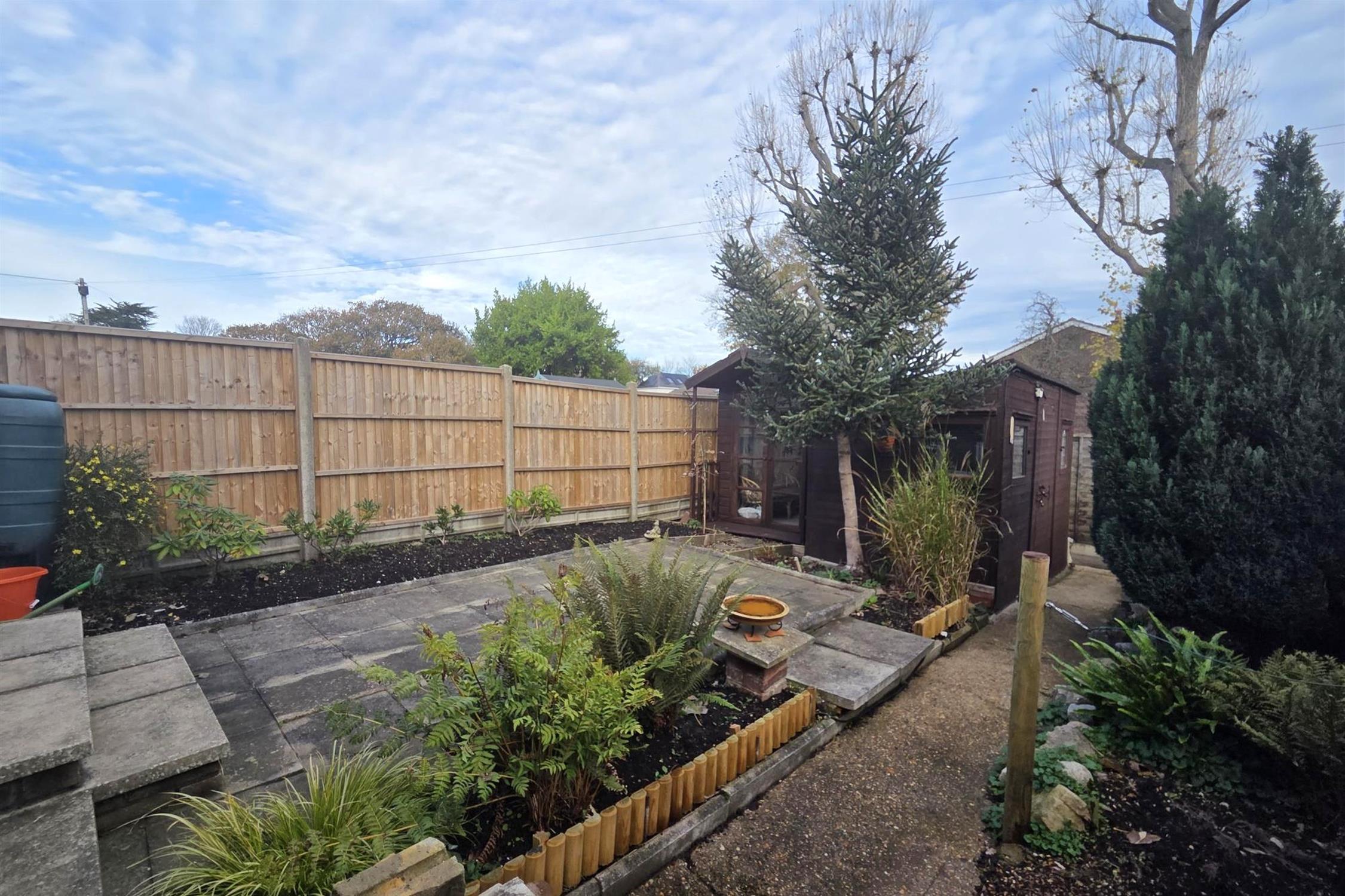 The rear garden has an initial patio area. Path leading to the gated rear pedestrian access and timber garden shed. Summerhouse. Borders with mature and well-maintained trees. Outside power.