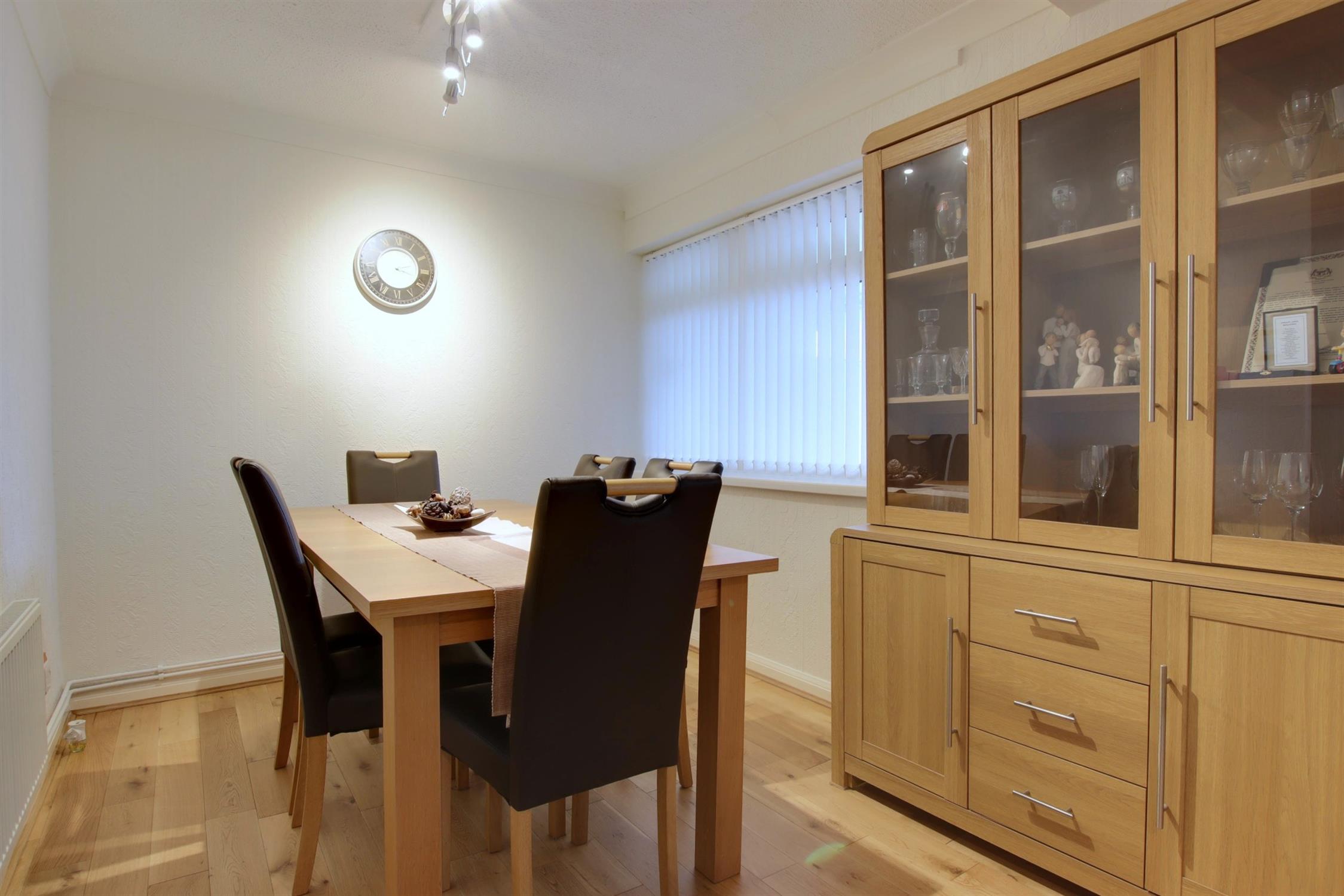 Double glazed bow window to the front aspect. Matching wall and base units with contrasting wooden work surfaces. Inset stainless steel sink and drainer. Four ring gas hob with extractor above. Fitted oven/grill and microwave. Integrated appliances include fridge, washing machine and slimline dishwasher. Modern tall radiator. Continuation of the flooring from the entrance hall.