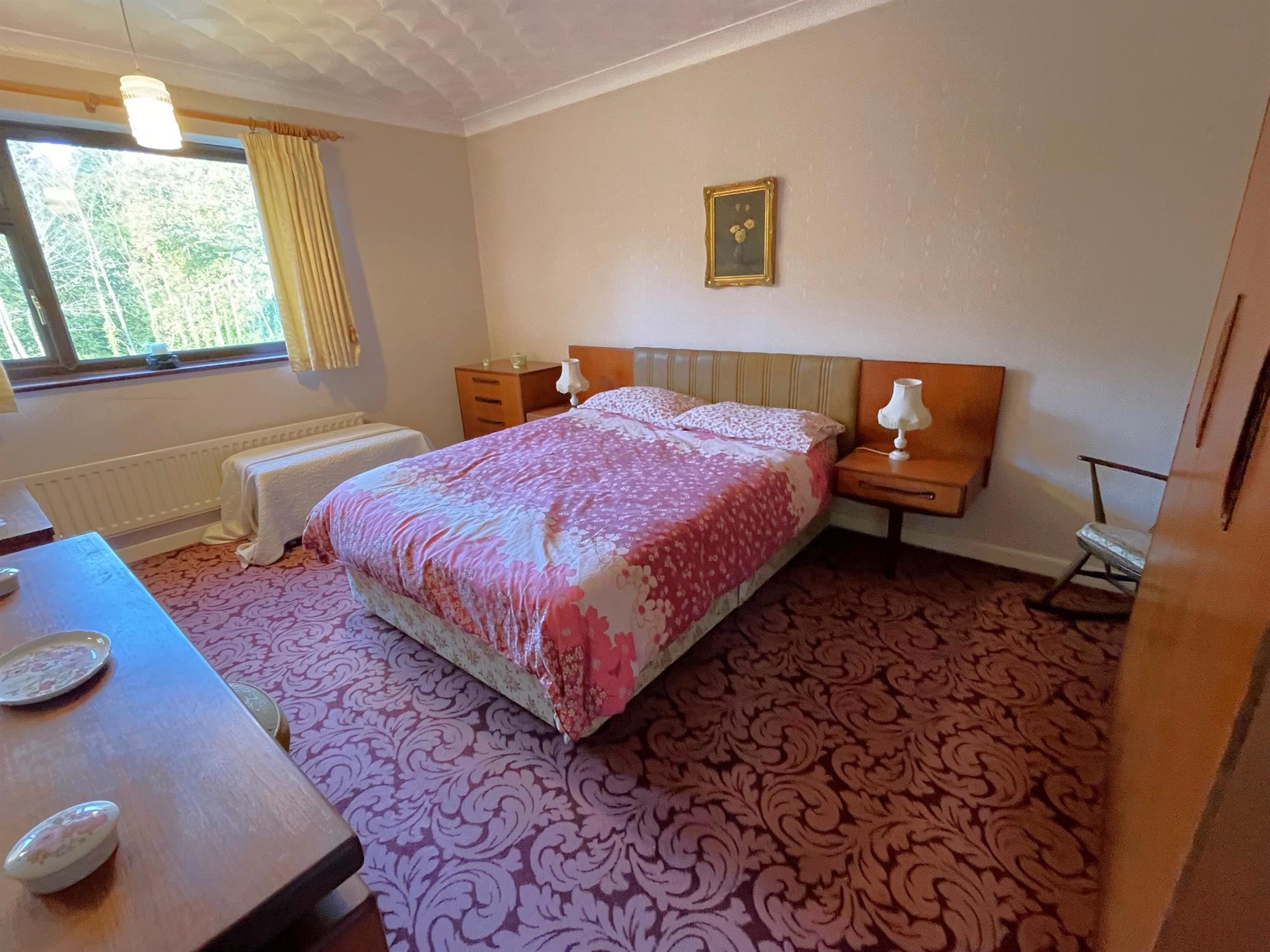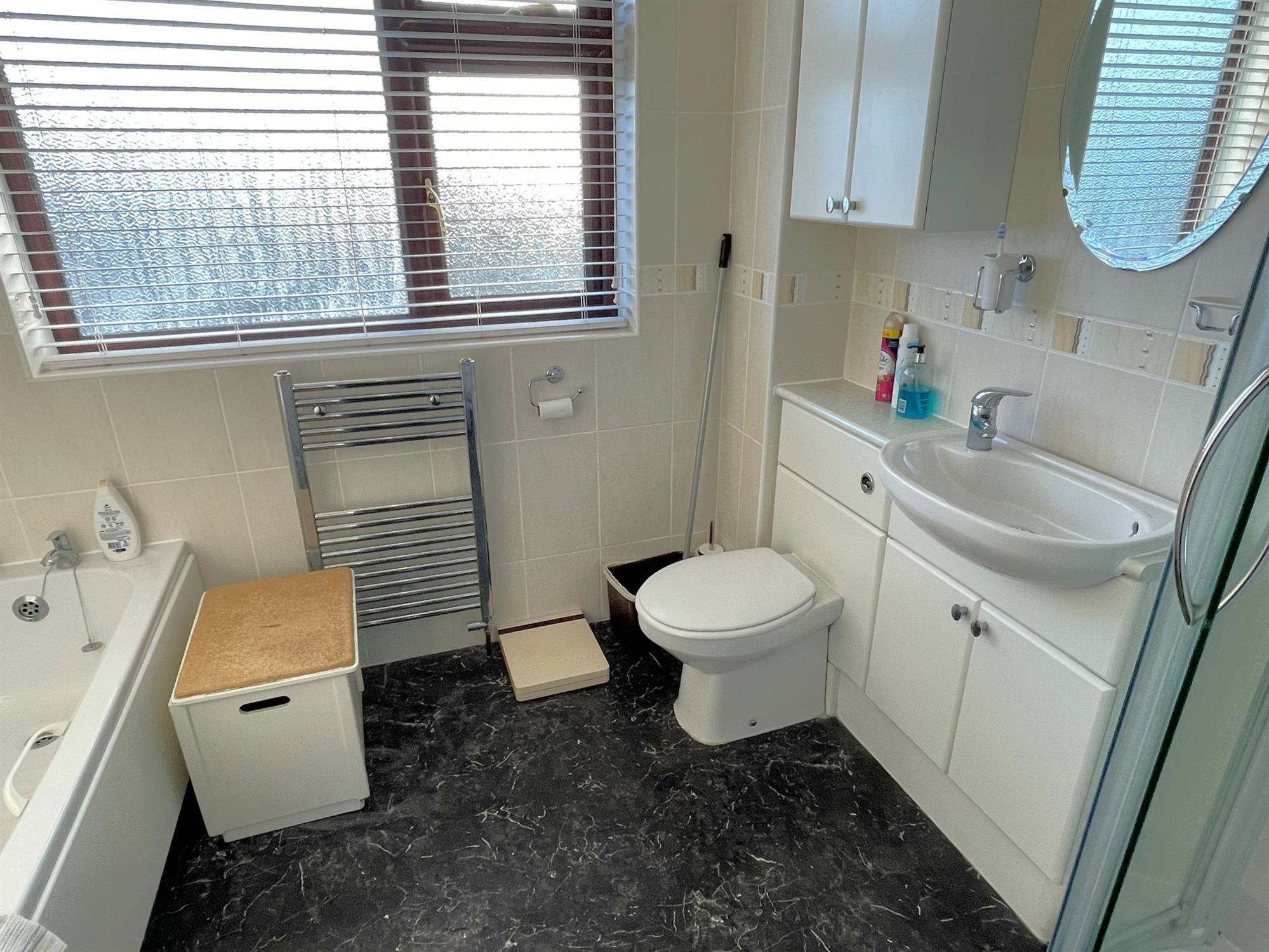 Window to rear. Low level WC with concealed flush. Inset wash hand basin with cupboard below. Panelled bath. Corner shower unit with glazed screen. Complementary tiling. Heated towel radiator.