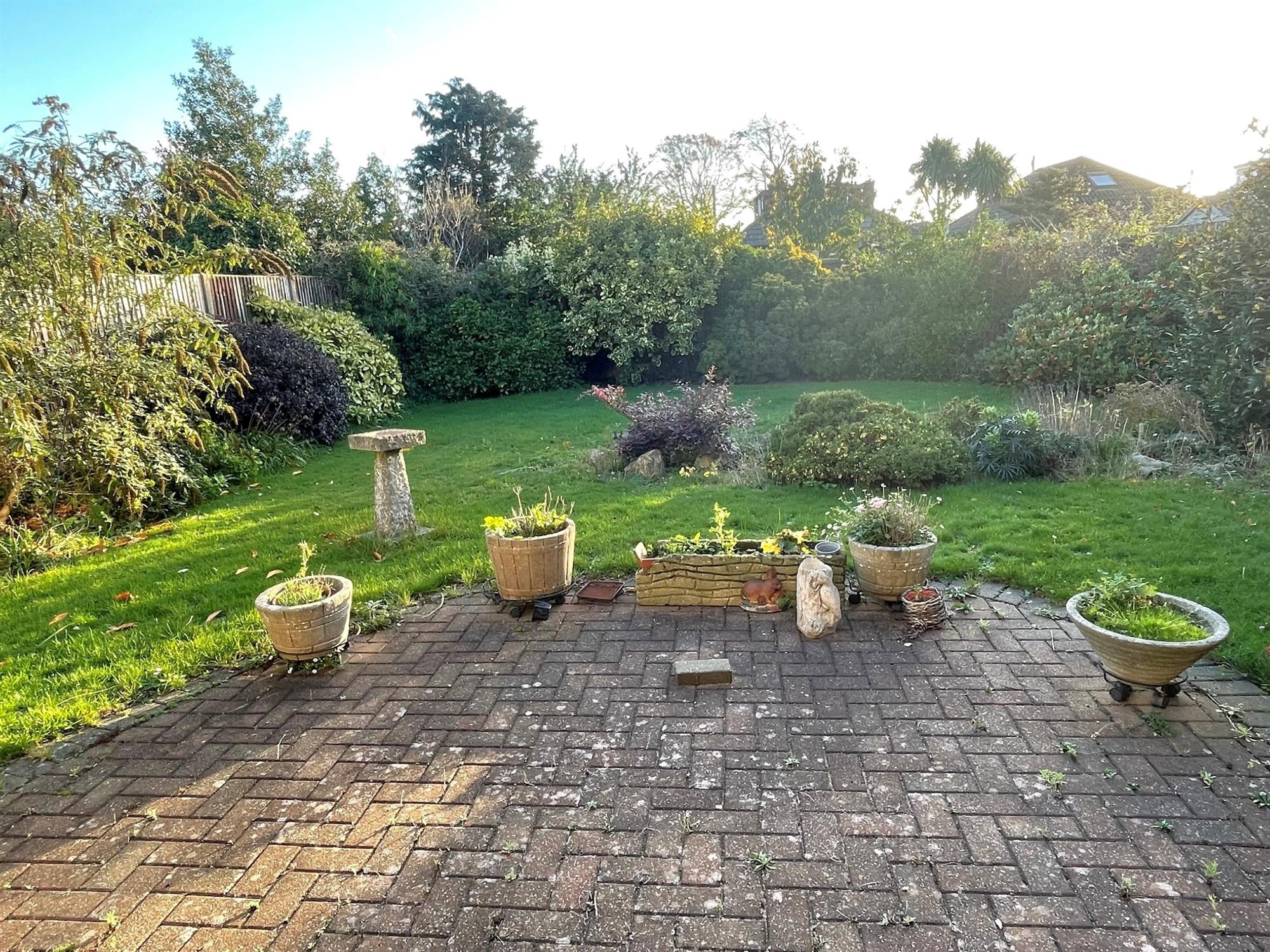Block paved patio. Laid to lawn with mature shrubs, bushes and plants.