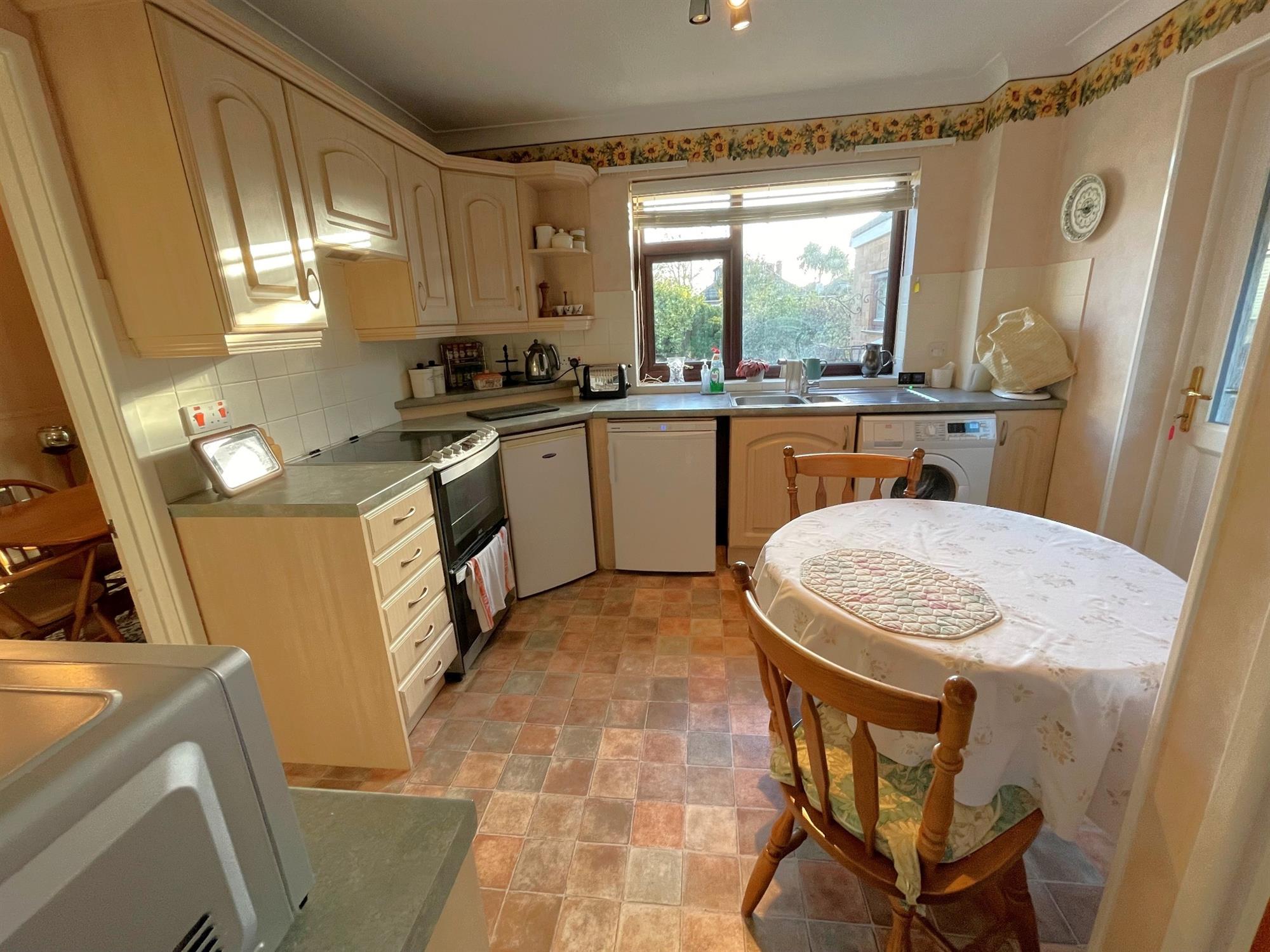 Window to rear. Door to side lobby. Range of wall and base units with working surfaces over. One and a half bowl stainless steel sink unit. Tiled splashbacks. Space for cooker. Space and plumbing for washing machine. Space for fridge and freezer. Built-in storage cupboards.