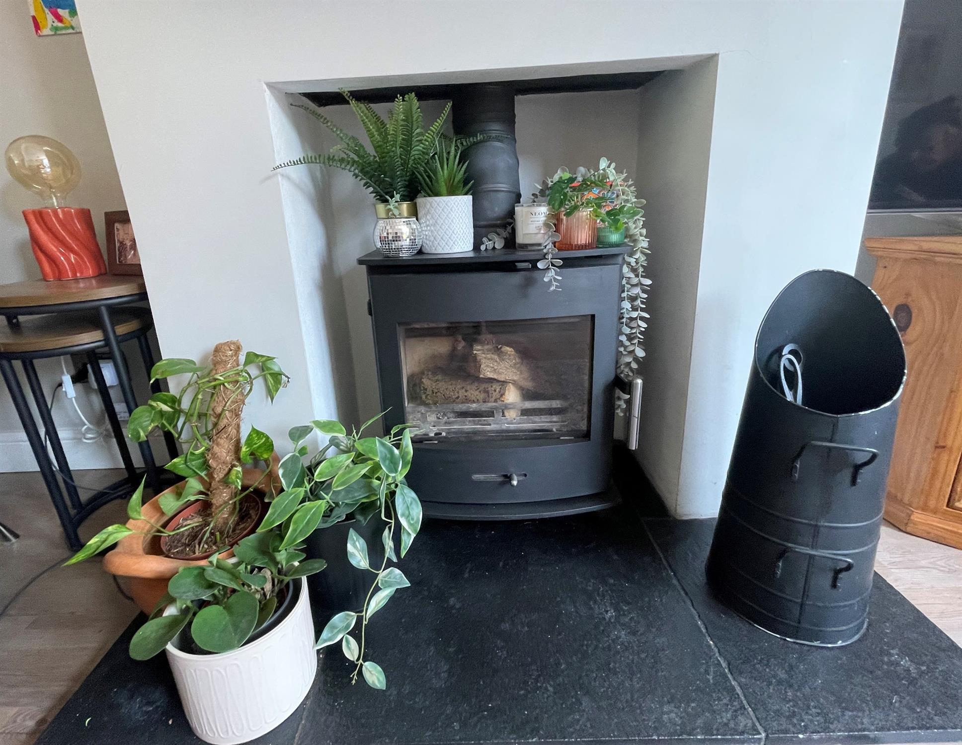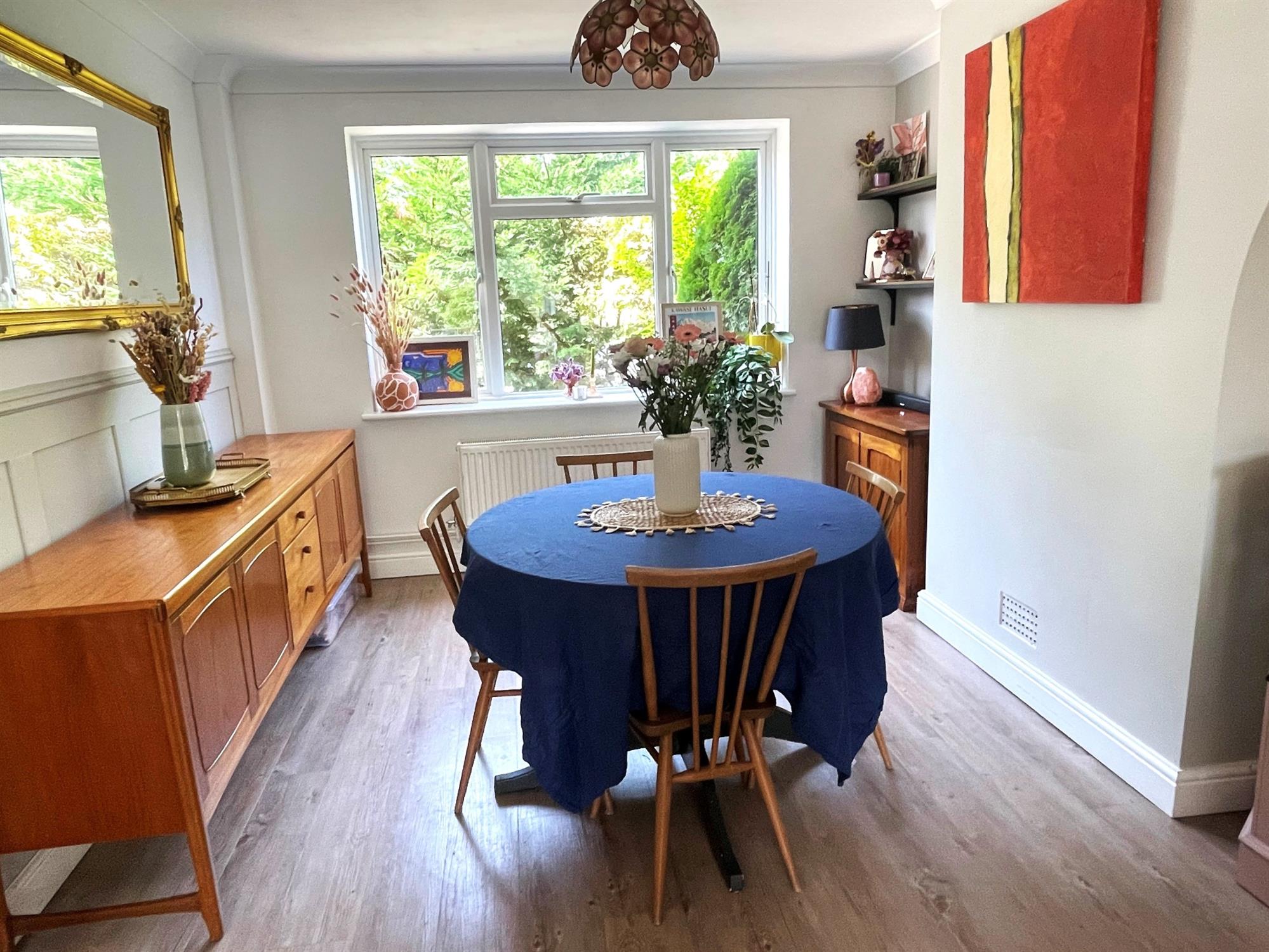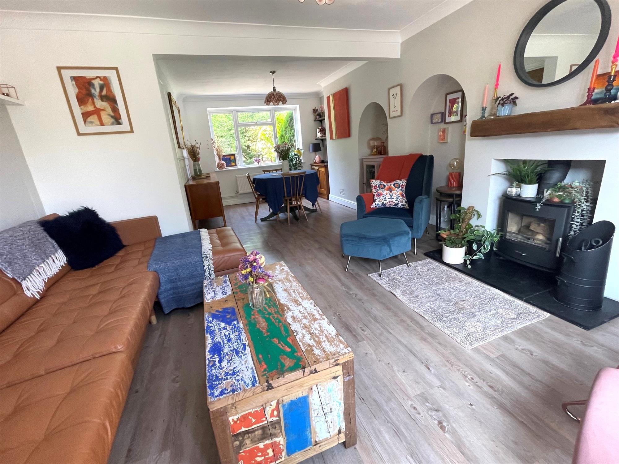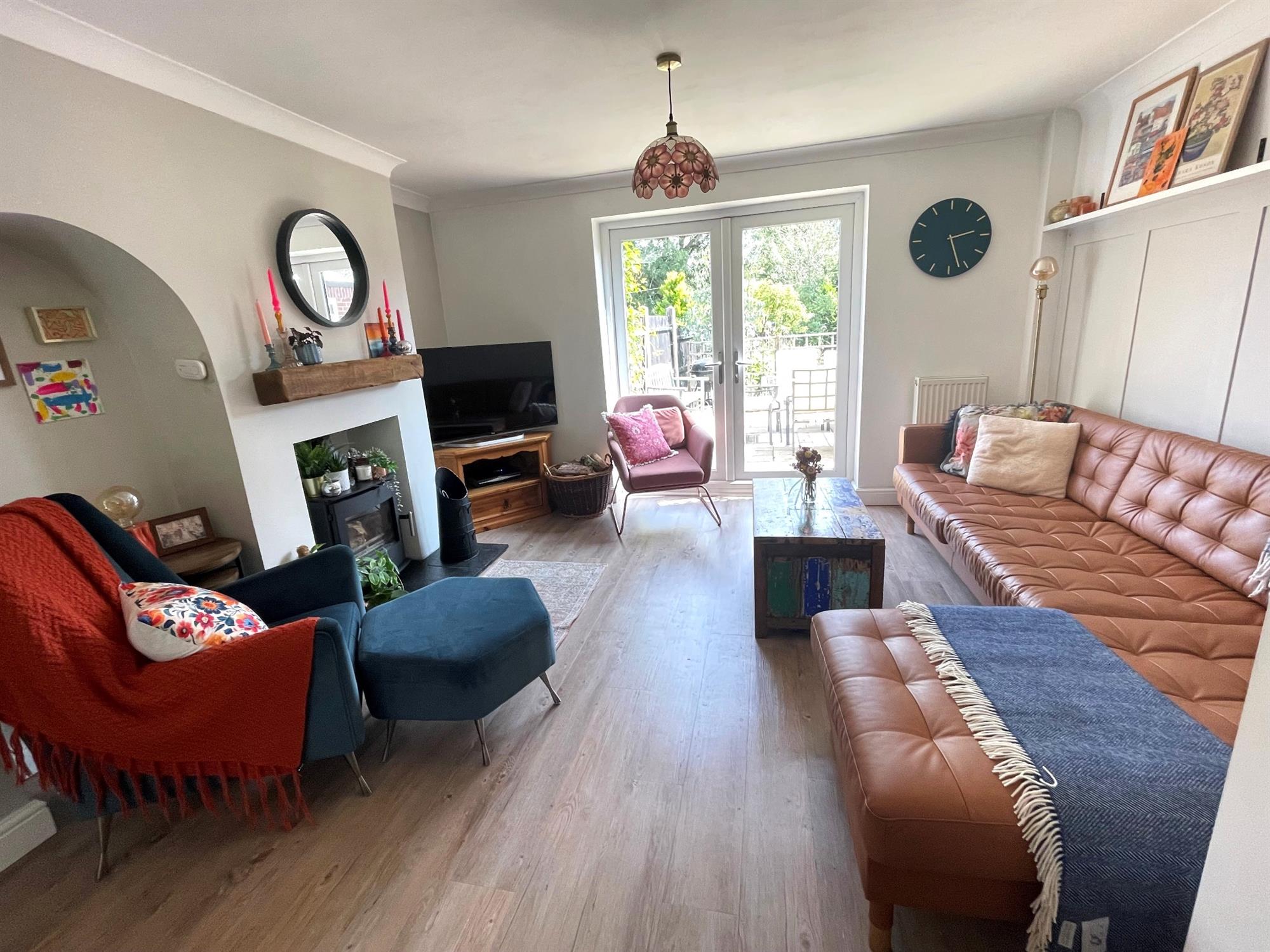 Window to front. Double opening french doors to garden. Feature chimney breast with slate hearth and oak mantle over with wood burner fitted. Karndean flooring. Two radiators.