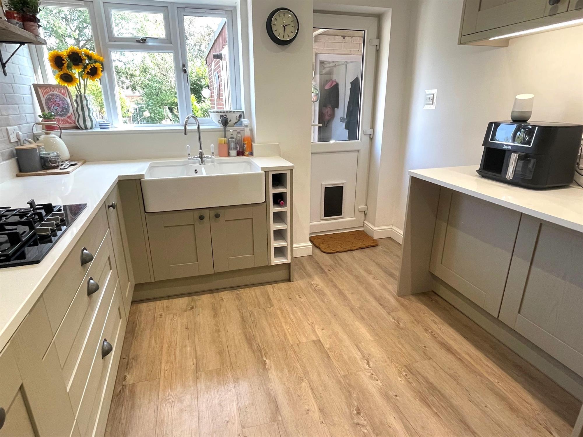 Window to rear. Refitted and comprising a comprehensive range of wall and base units with Quartz working surfaces and upstands with complementary ceramics above. Inset double bowl enamel Butler sink with mixer tap. Inset Bosch gas hob with concealed extractor hood fitted over. Built in eye level Siemens electric double oven. Built in microwave. Integrated fridge/freezer. Fitted Quartz breakfast bar. Karndean flooring. Designer radiator. Door to rear and: