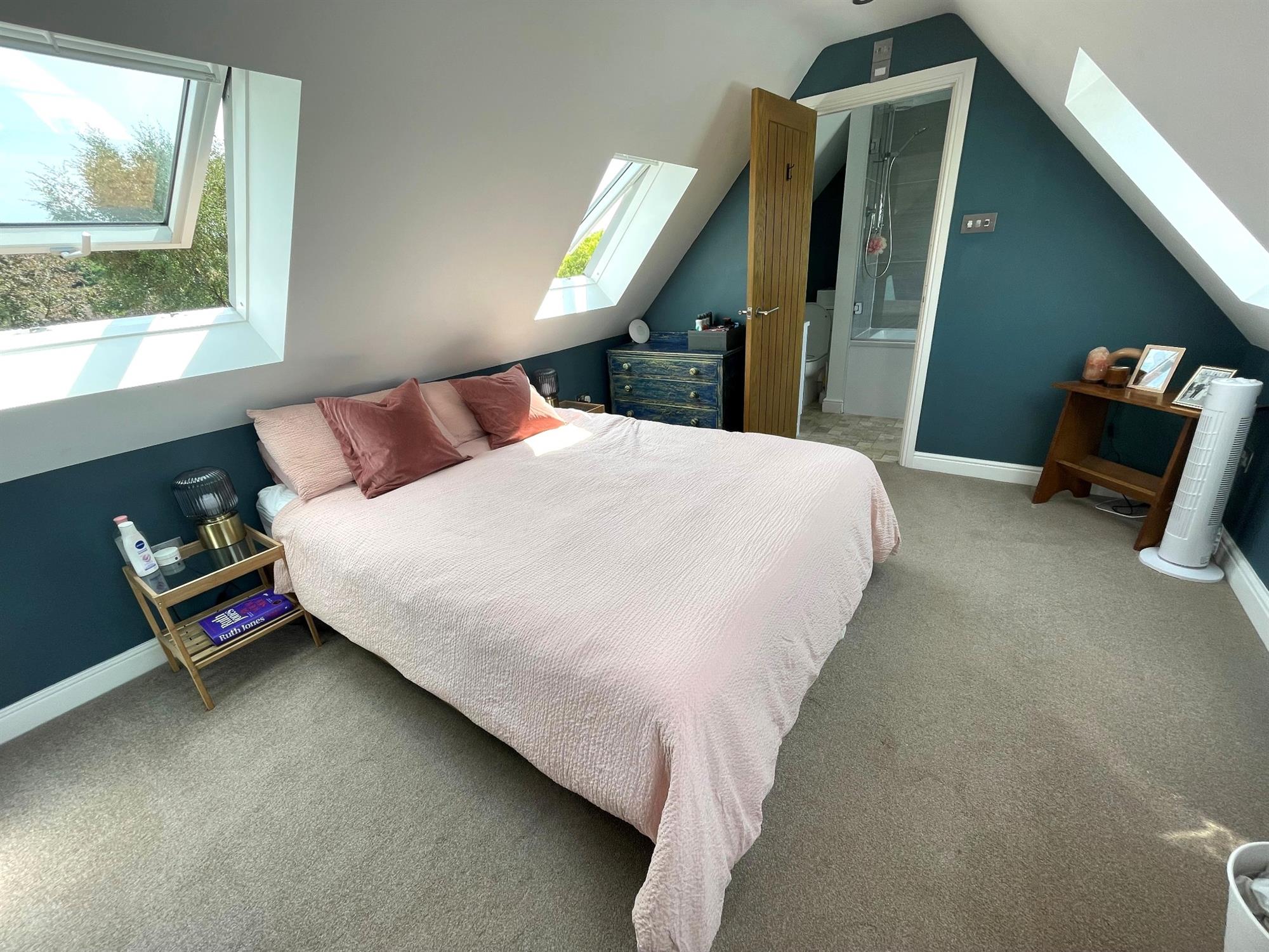 A double room with two velux windows to front and rear. Inset lighting. Radiator. Door to: