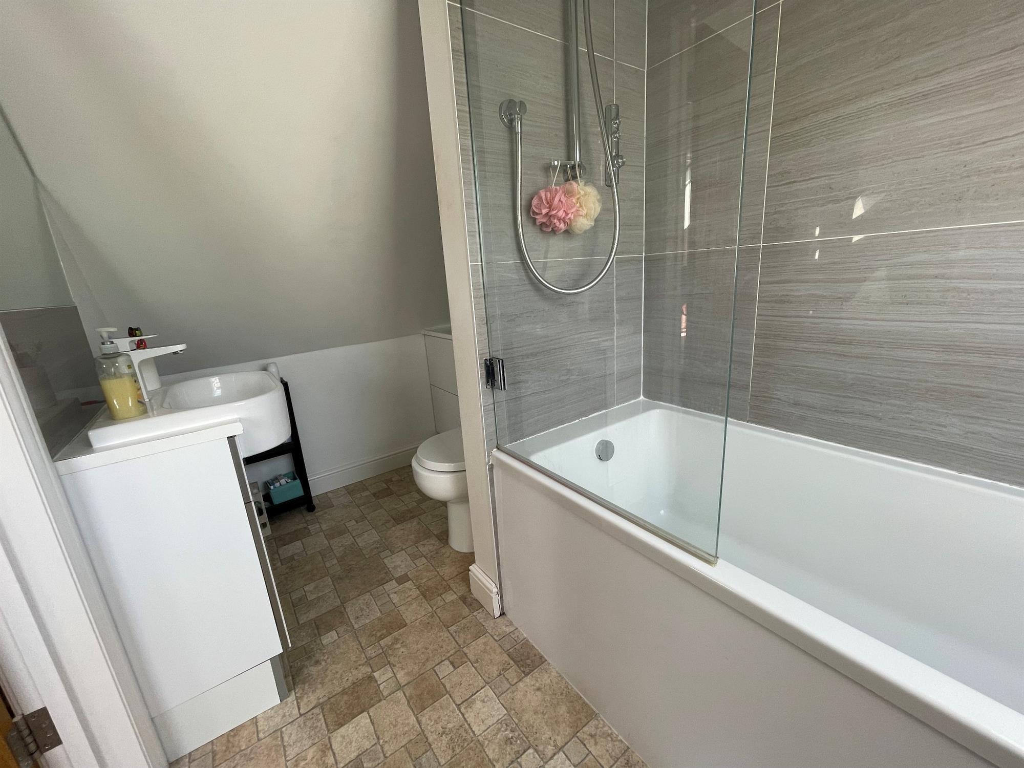 Velux window to front. Comprising a white suite of panelled bath with glass shower screen and shower fitted over. Vanity wash hand basin with cupboards below. Concealed flush WC with storage to side. Complementary tiling. Inset lighting. Extractor fan.