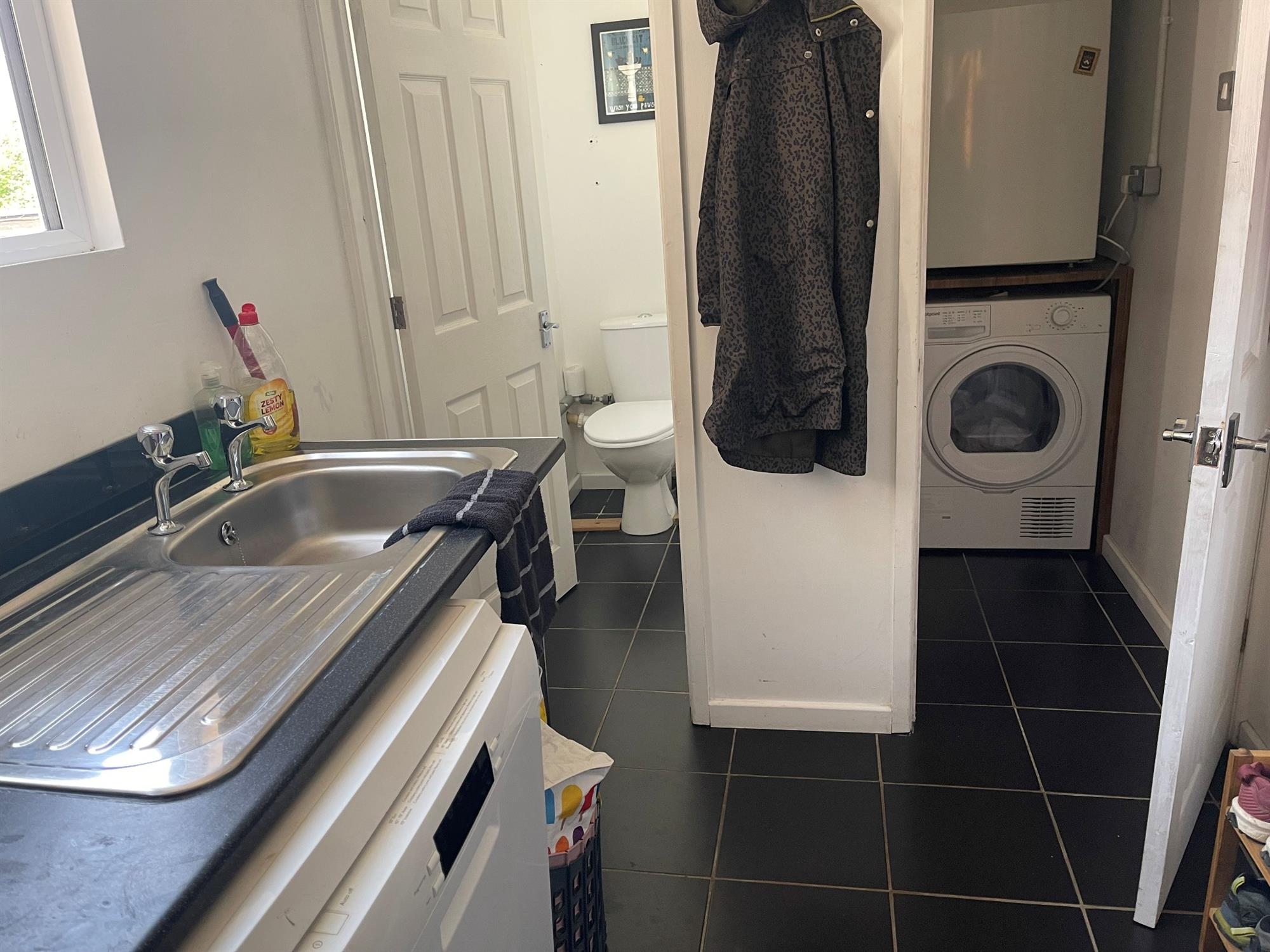 Window to side. Worktop with space and plumbing for dishwasher. Inset sink. Wall mounted Worcester combination boiler. Door to storage room with plumbing for washing machine and tumble dryer. Door to WC.