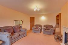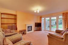 Smooth plastered ceiling. UPVC French doors leading to rear patio. Radiator. Feature flame effect log fire in decorative surround. Feature serving hatch through to the kitchen with glass sliding doors.