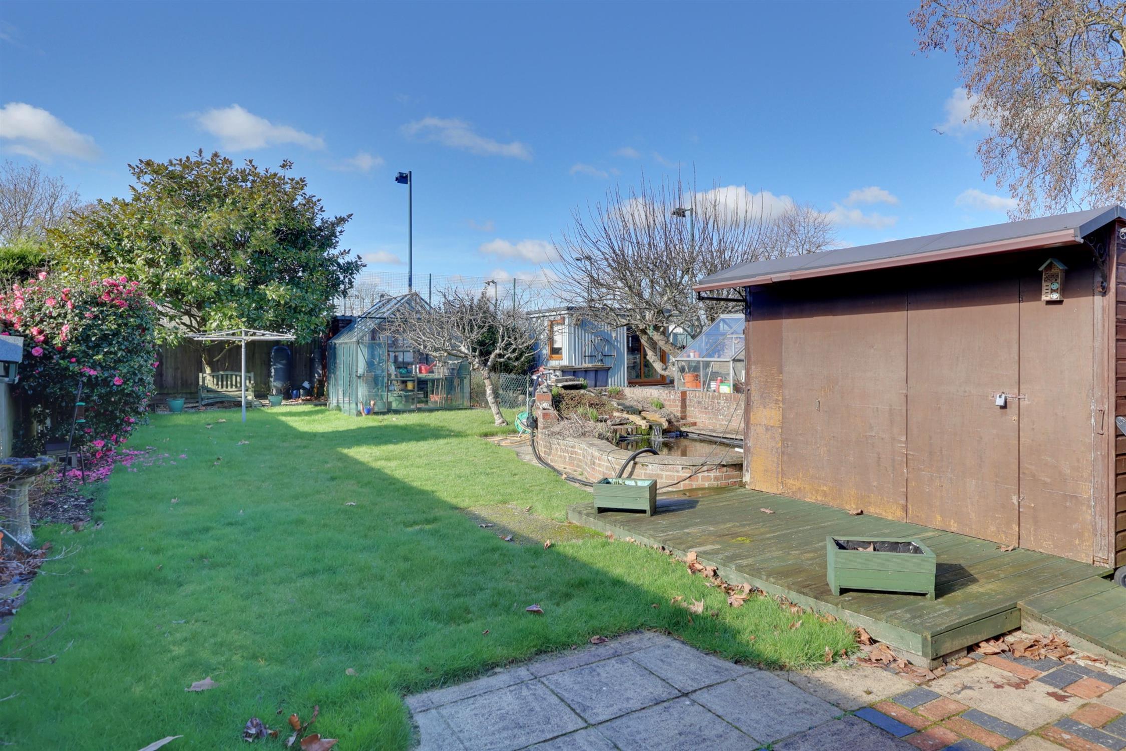Fence enclosed with planted borders. Mainly laid to lawn with paved patio area. Decorative brick-built pond with decorative waterfall feature. Timber built shed, greenhouse and side access.