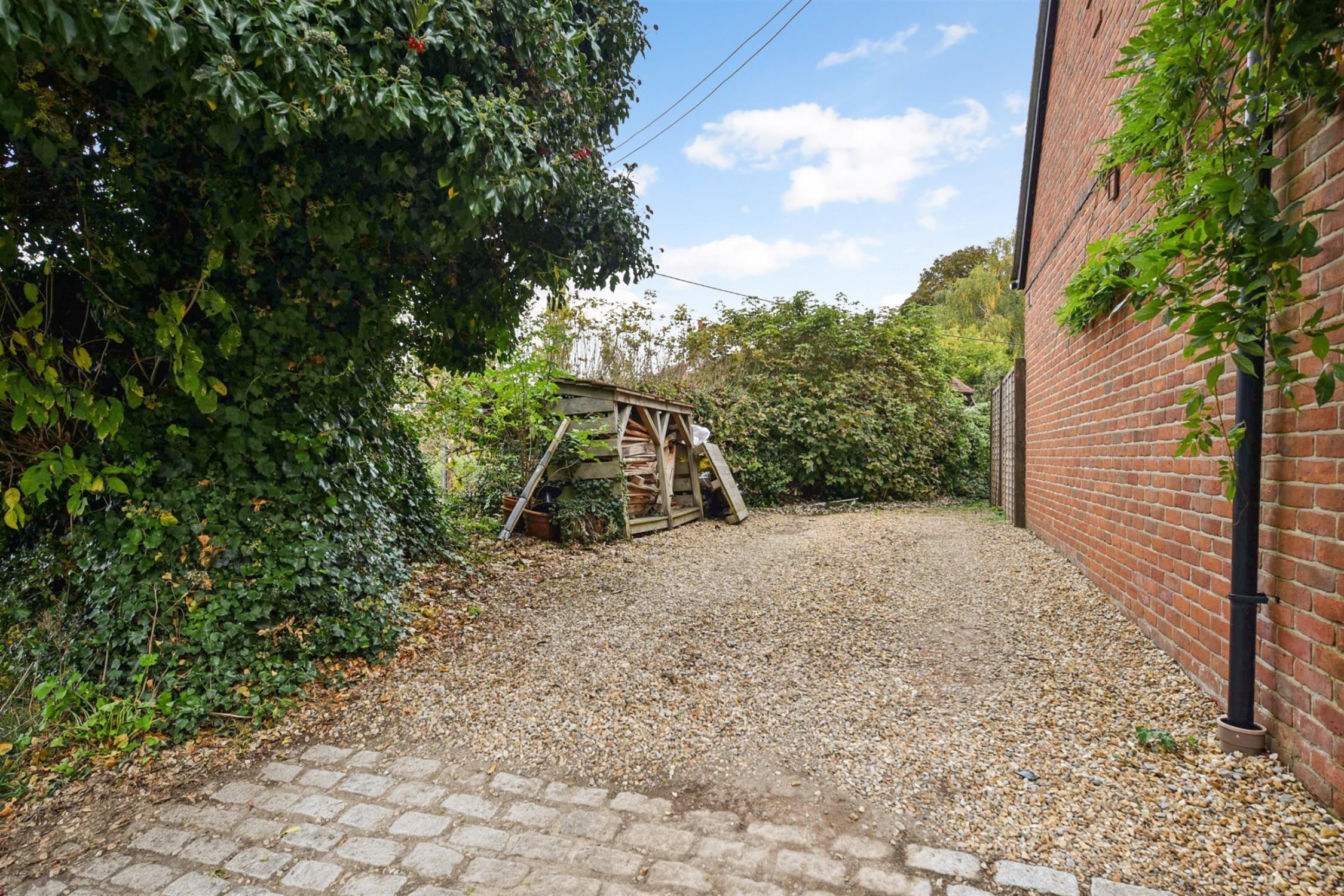 DRIVEWAY PARKING: The driveway parking is located to the side of the adjoining cottage which allows for two tandem parked cars. A pathway continues from the driveway to the rear access gate of the garden, where the private drainage tank and calor gas bottles are kept.