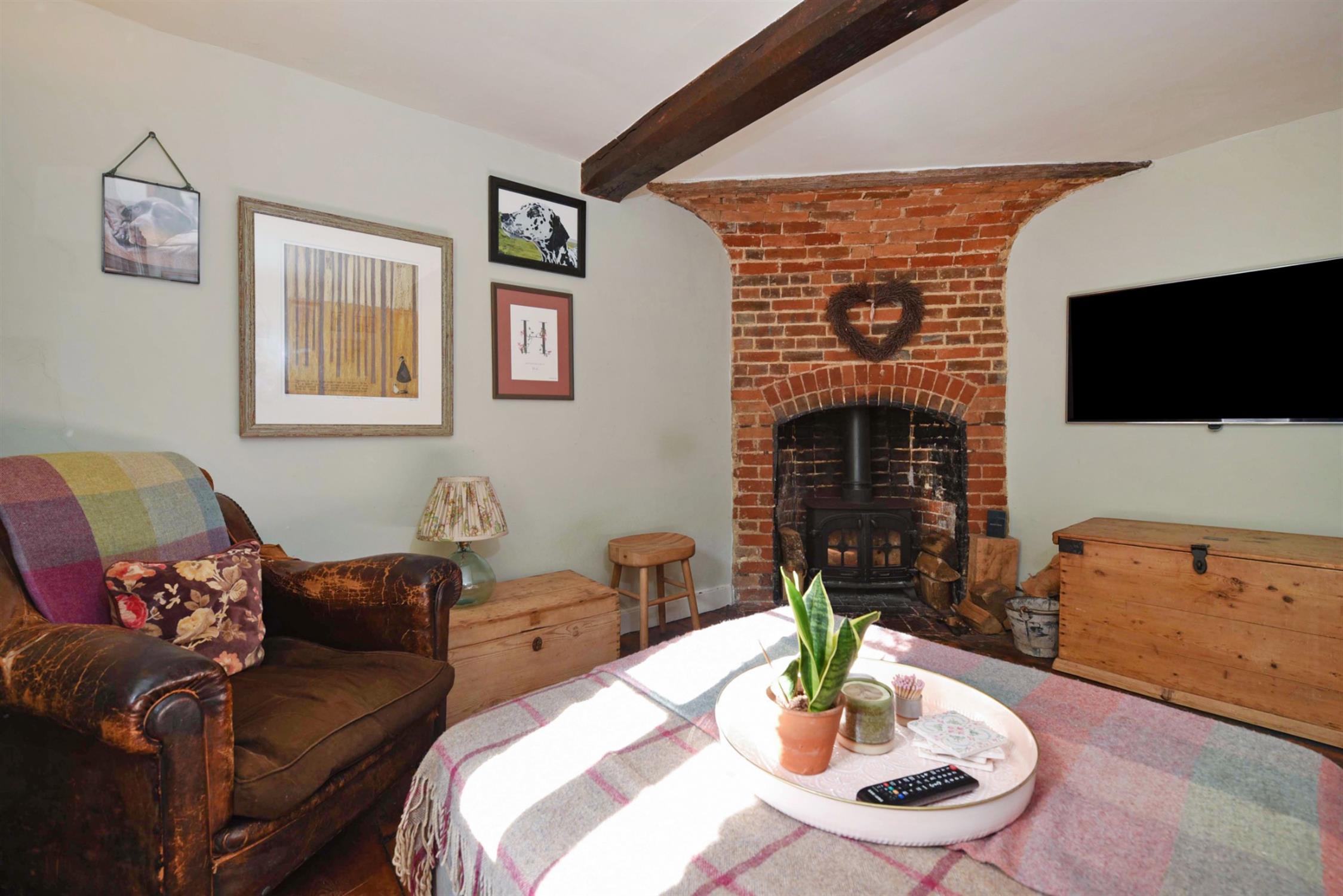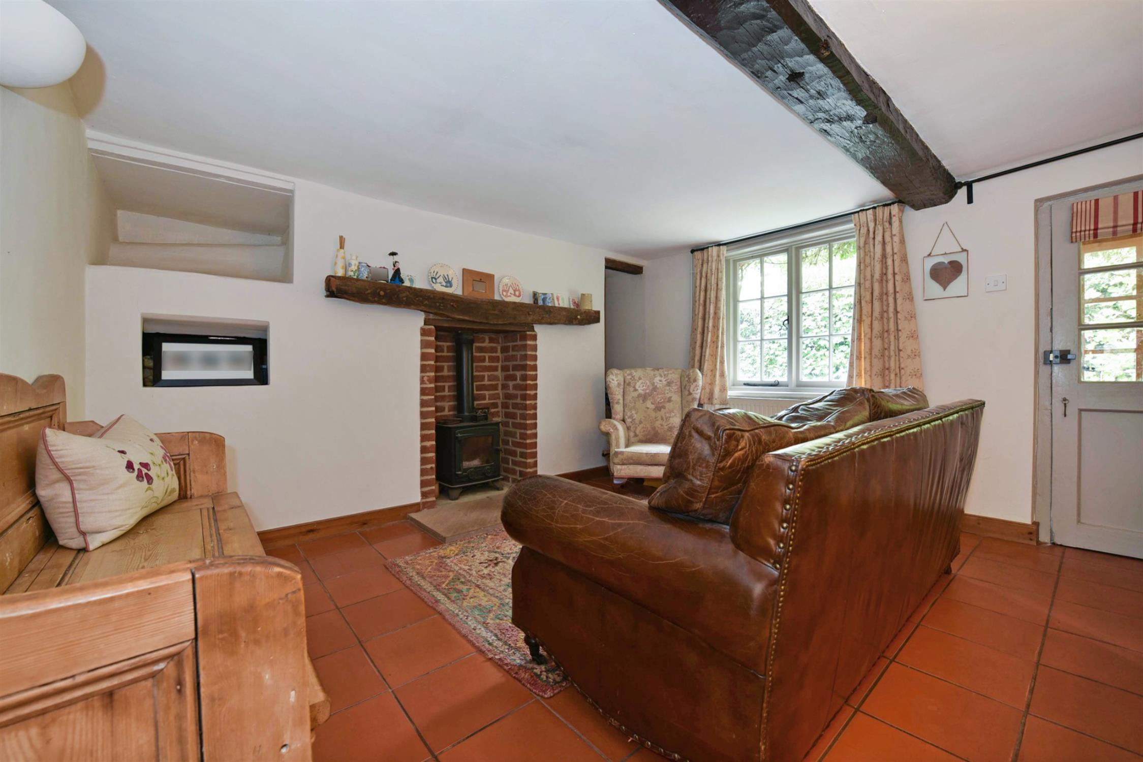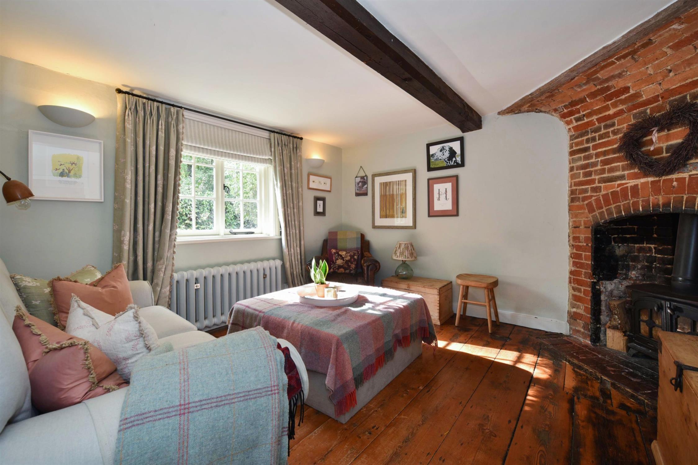 The sitting room has a lovely ambience with exposed wood flooring, ceiling beam and an exposed brick corner fireplace with fitted wood burning stove. There is a cottage style window to the front aspect. Wall lighting and a period style radiator.