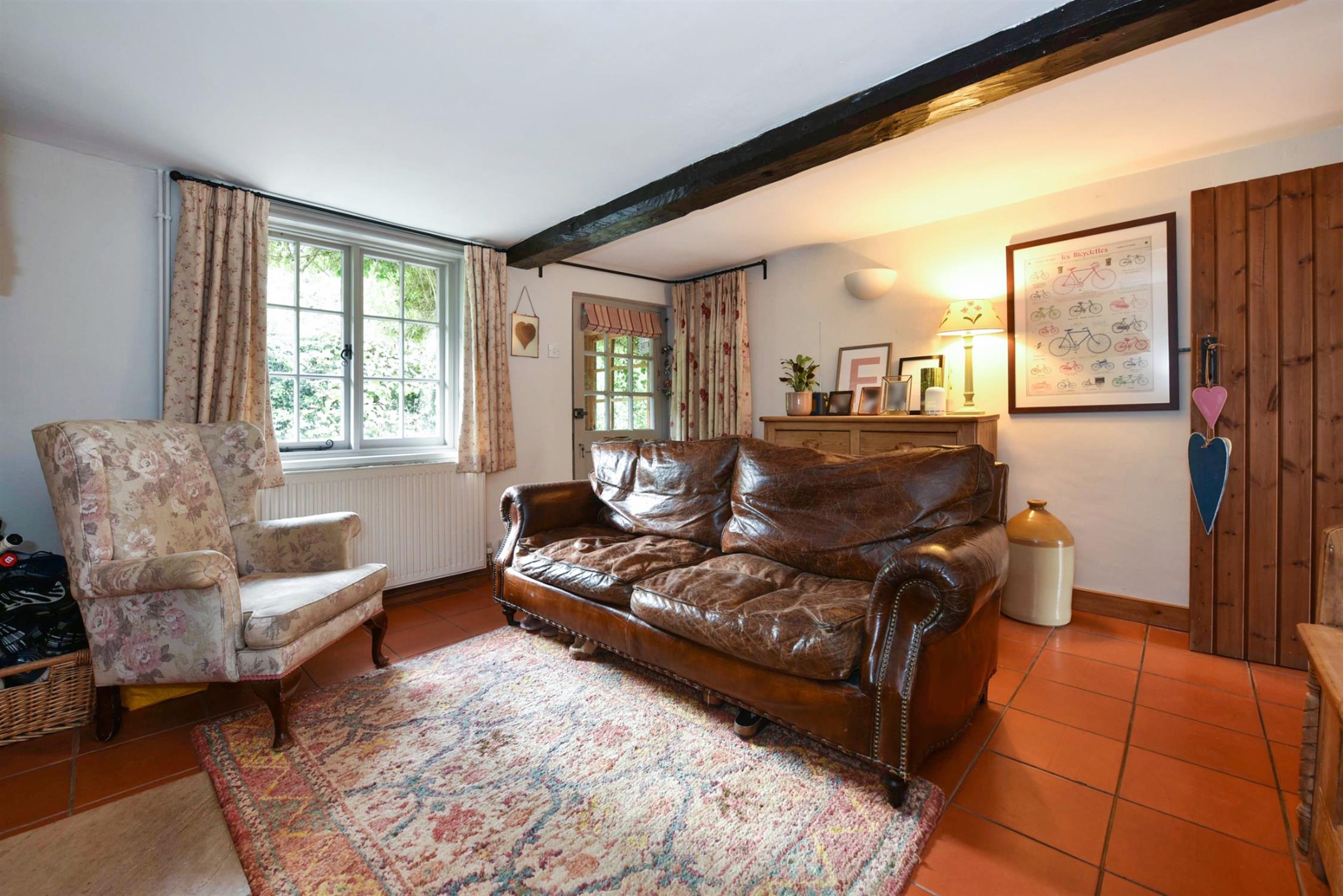 The family room, is a versatile reception room, which could also be easily used as an impressive dining room or study. The room centres around the attractive fireplace which has exposed brick work with an oak beam over and a fitted wood burning stove. There is a practical, tiled floor in keeping with the cottage and a cottage style window to the front aspect. Exposed ceiling beam. Radiator. Latch door leading to: