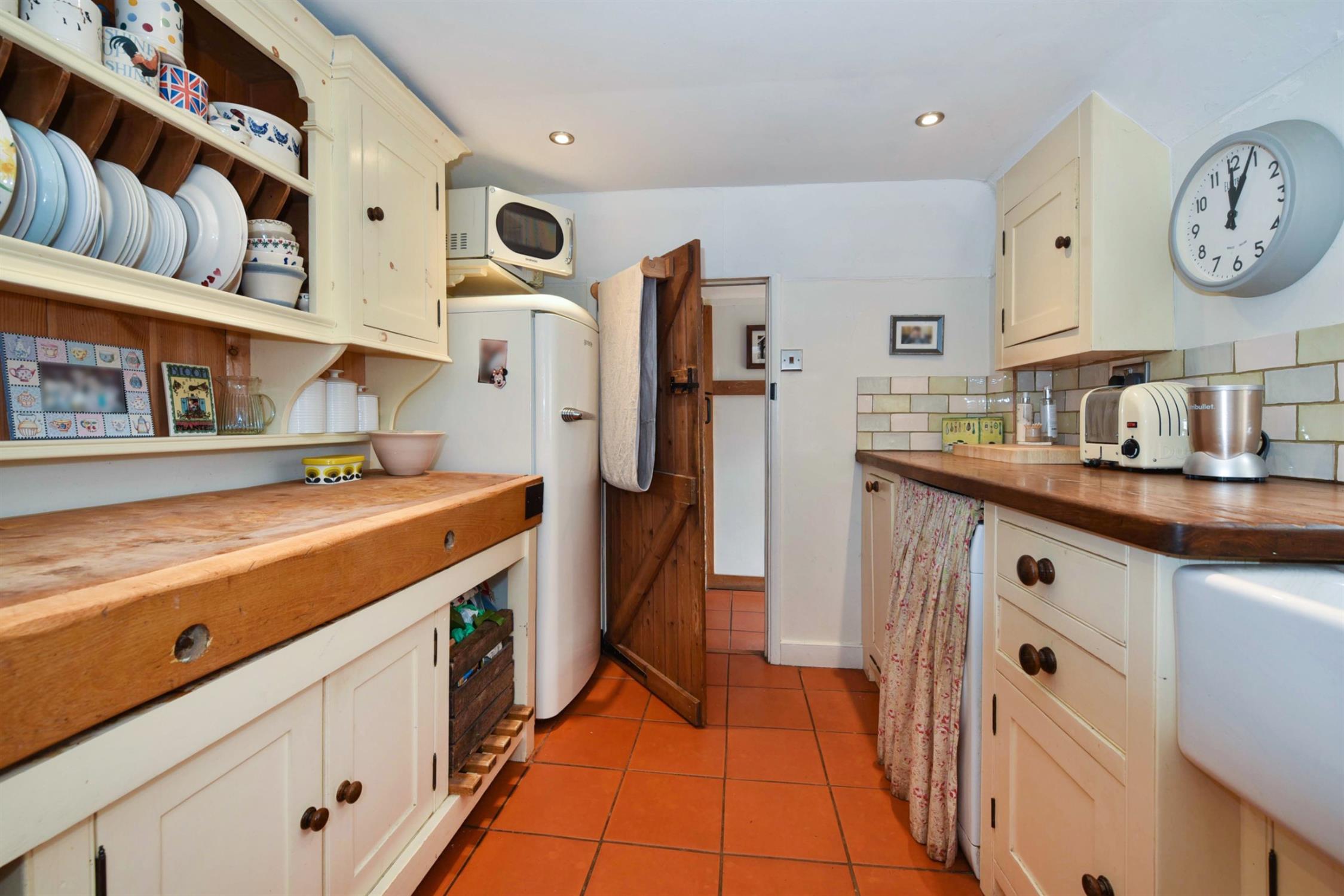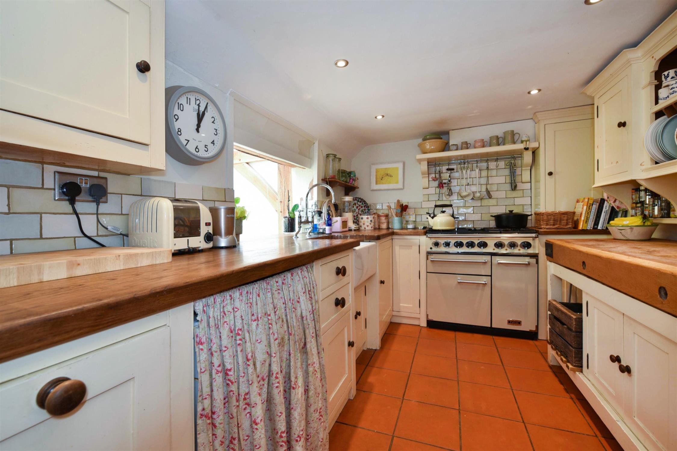 The kitchen is fitted with bespoke cream painted units and is complimented with oak worksurfaces, tiled splashbacks and a butler sink with mixer tap over. There is appliance spaces for a range style cooker, washing machine and free standing fridge. The Worcester boiler is concealed in a built in cupboard. Tiled floor. Inset ceiling lighting. A window size opening above the sink connects to the conservatory.