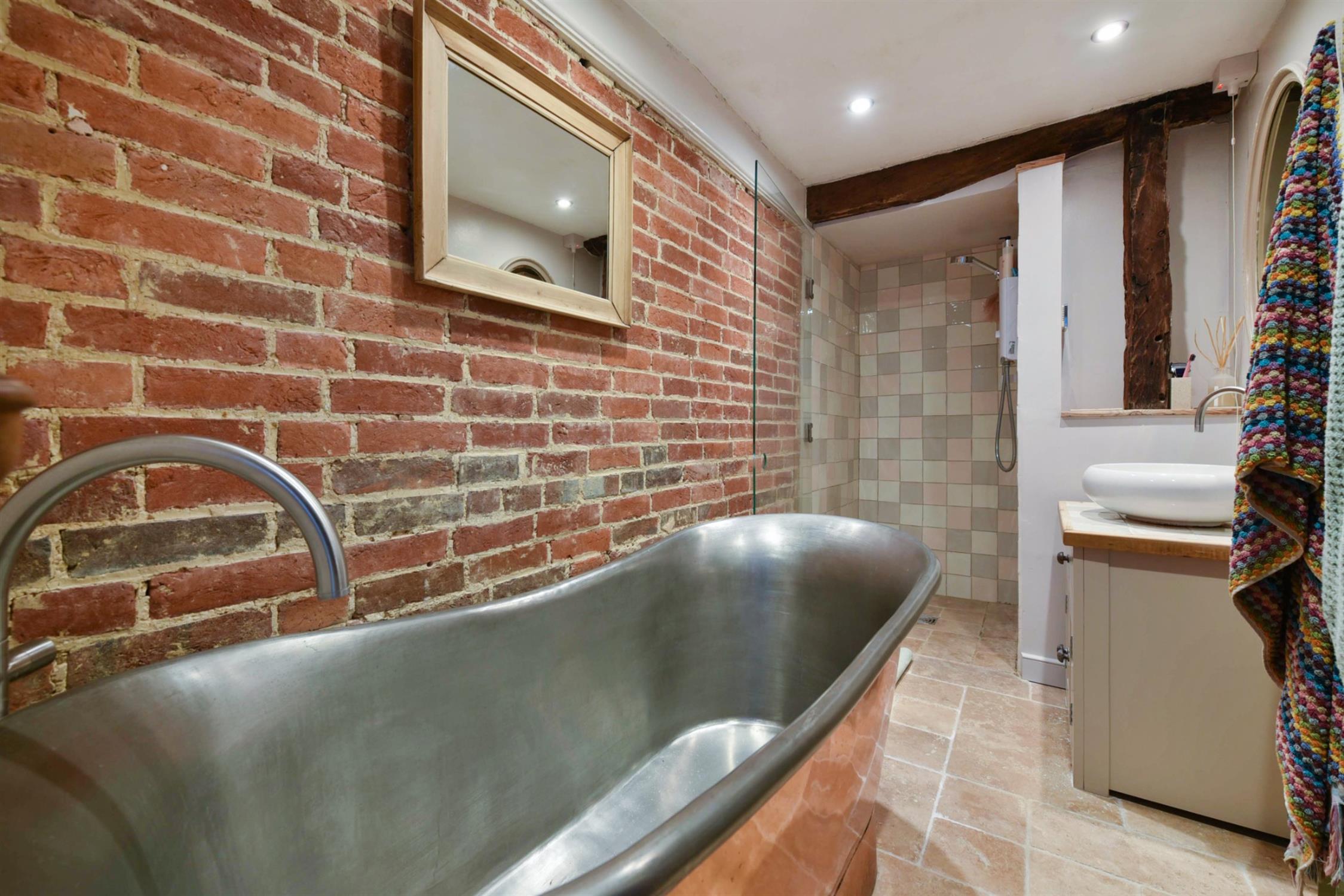 The bathroom has been stylishly and uniquely fitted to feature a most attractive free standing roll top bath which is complimented by the exposed feature brick wall. There is a tiled shower enclosure with clear door. Vanity unit with wash hand basin. Tiled floor. Radiator. Inset lighting.