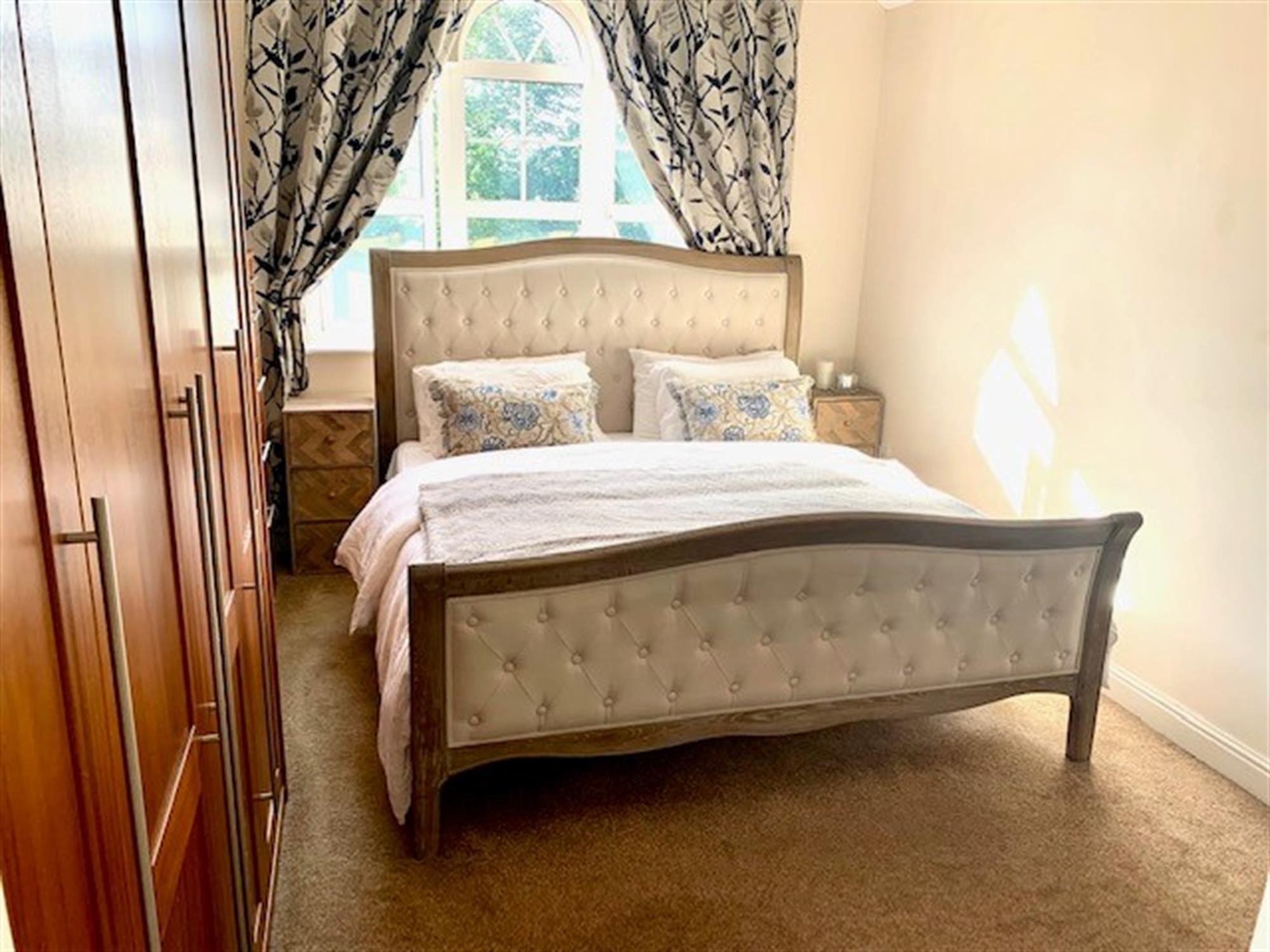 A double bedroom with carpet flooring, a door to the en-suite and a window to the rear.