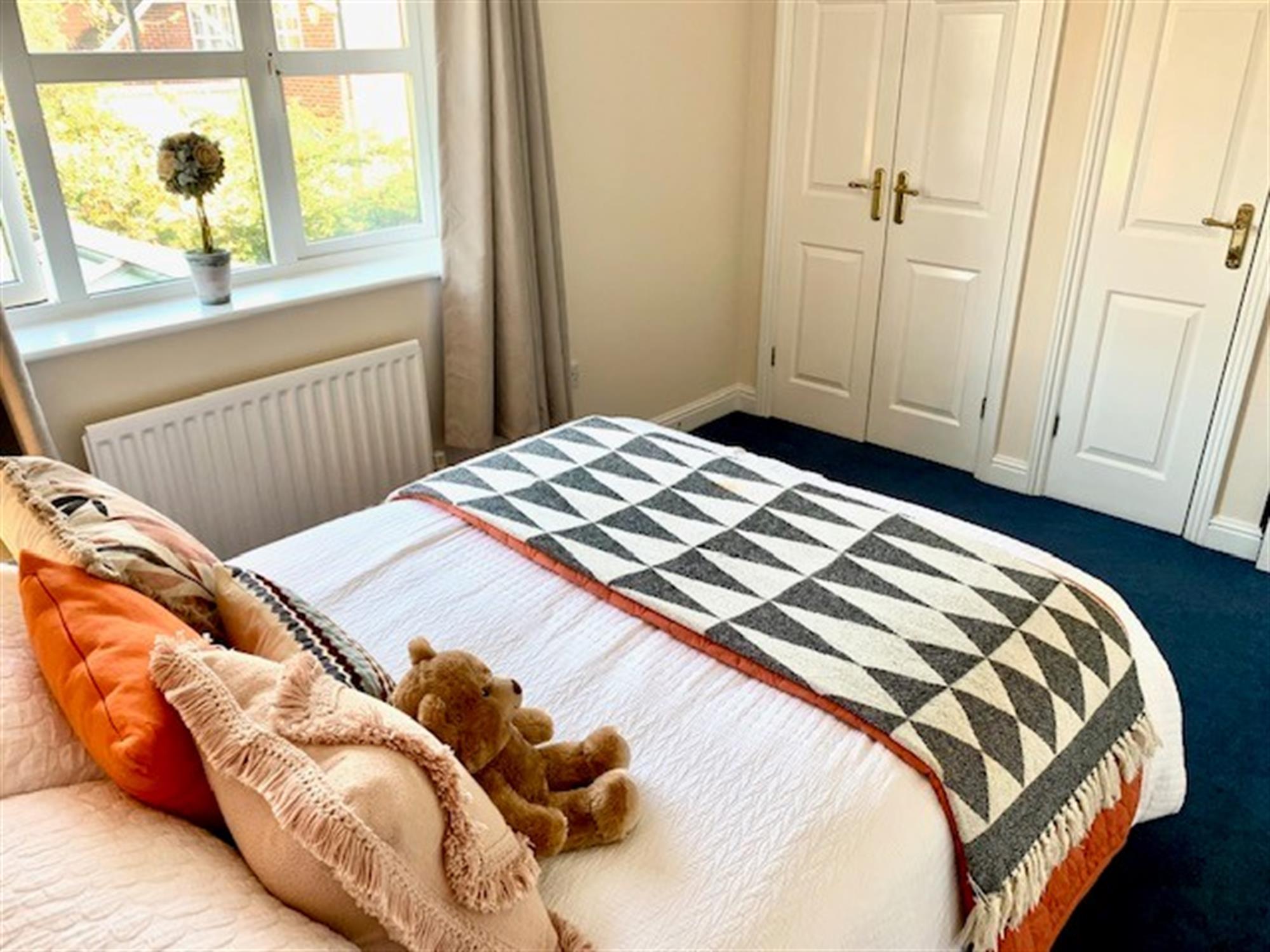 A double bedroom with carpet flooring, built-in wardrobes and a window to the rear.
