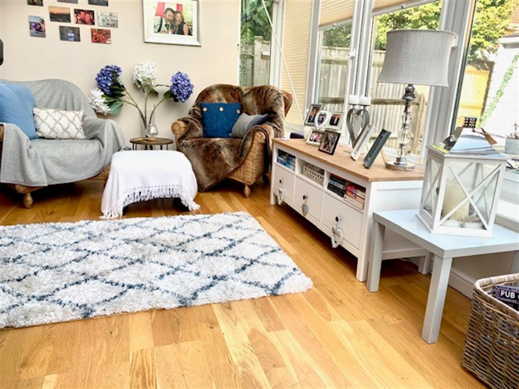 A spacious living room with laminate flooring and a mantelpiece with a gas fire, leading to the dining room and doors leading to the conservatory.