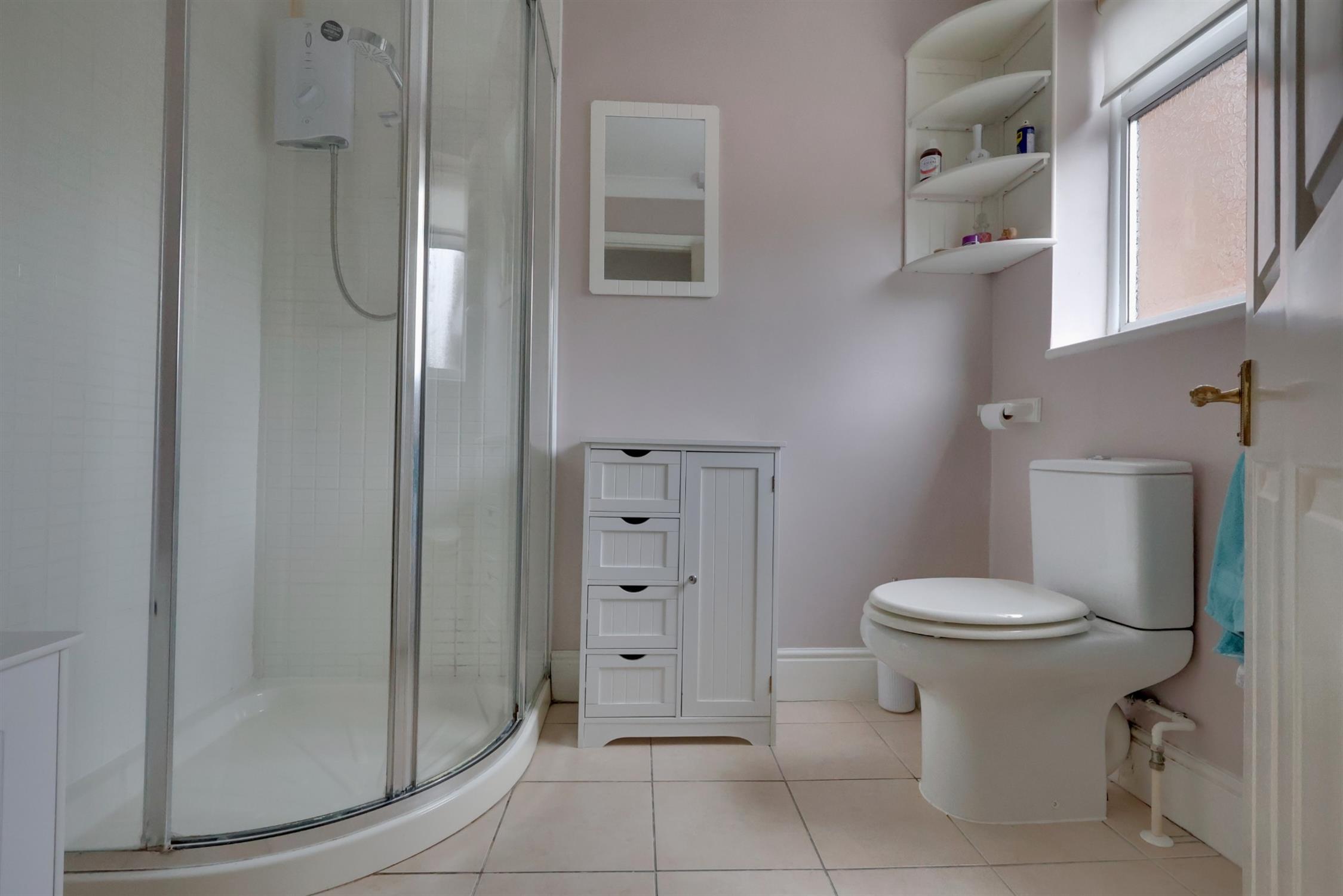 Obscure double-glazed window to side elevation. Low level W.C.. Pedestal wash hand basin. Shower cubicle. Part tiled walls, tiled floor.