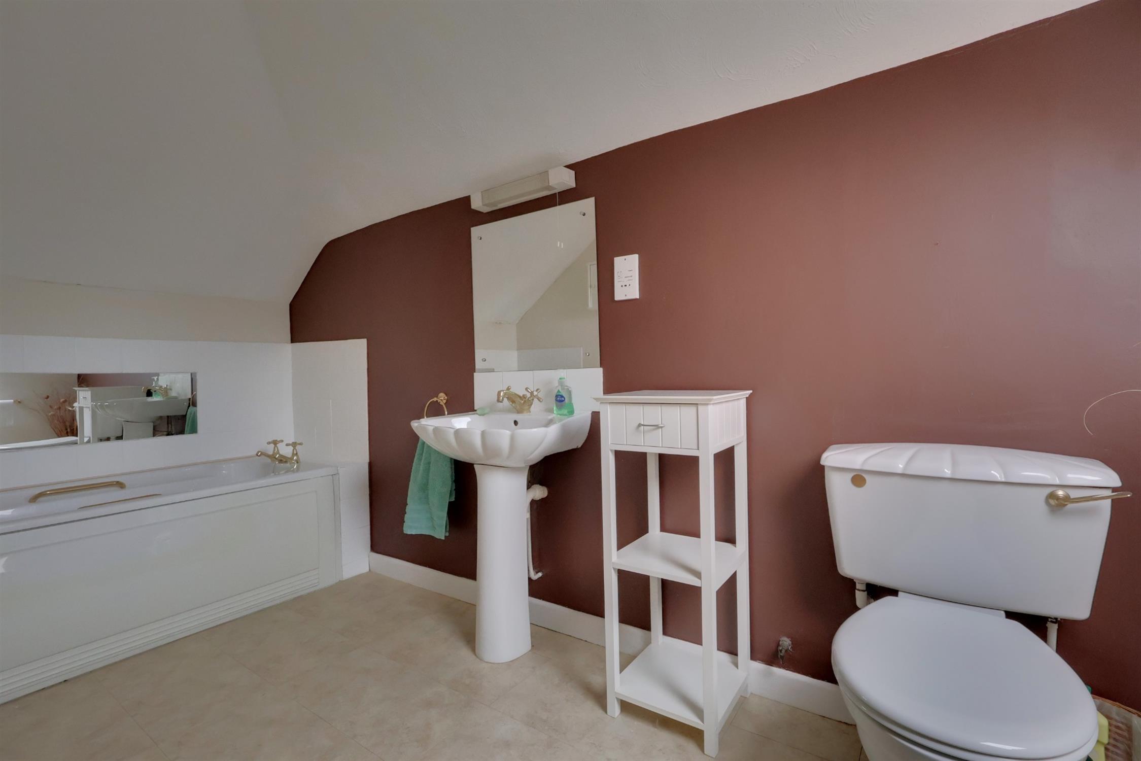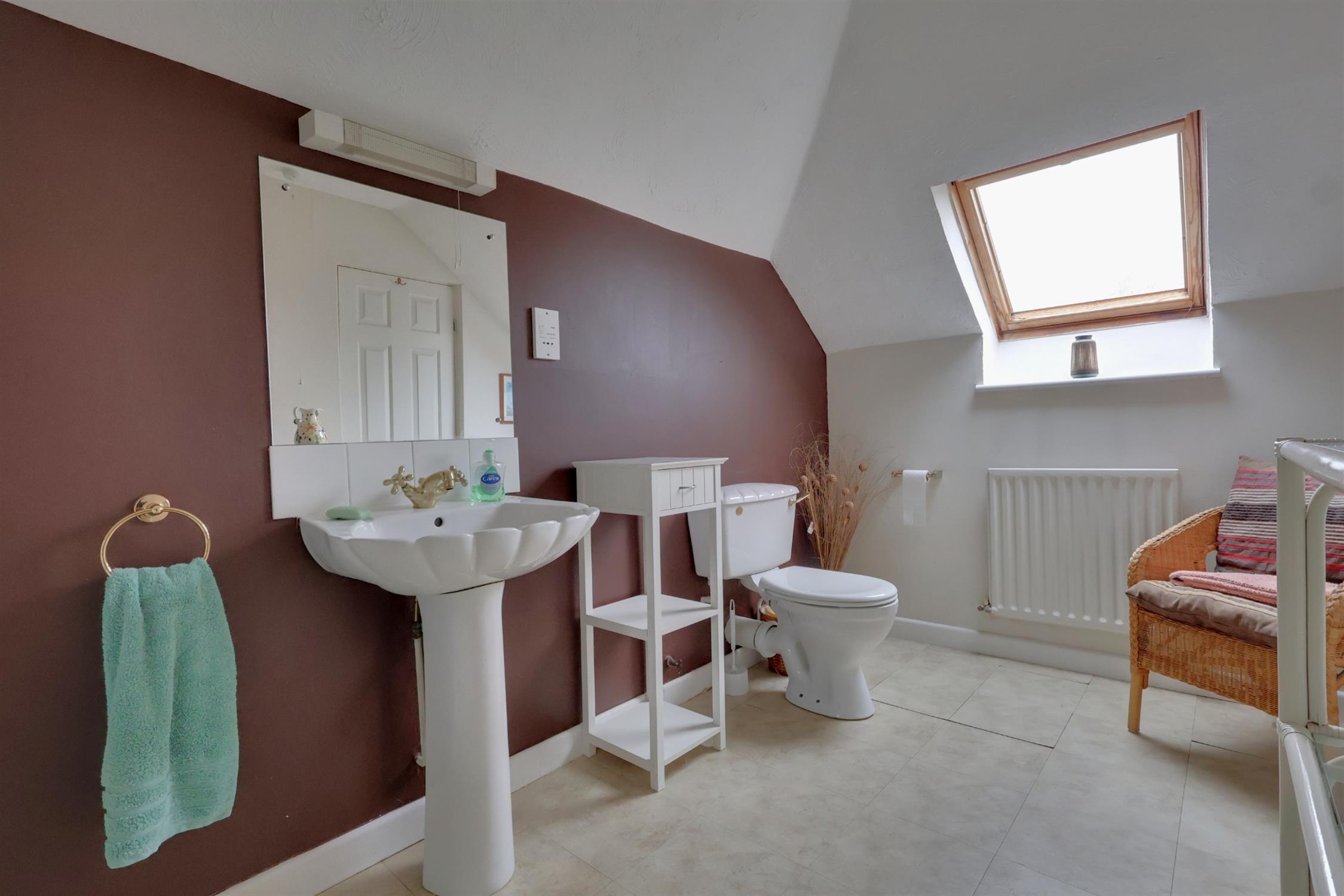 Double-glazed Velux window to front elevation. Panelled bath. Pedestal wash hand basin. Low level W.C. Part tiled walls.