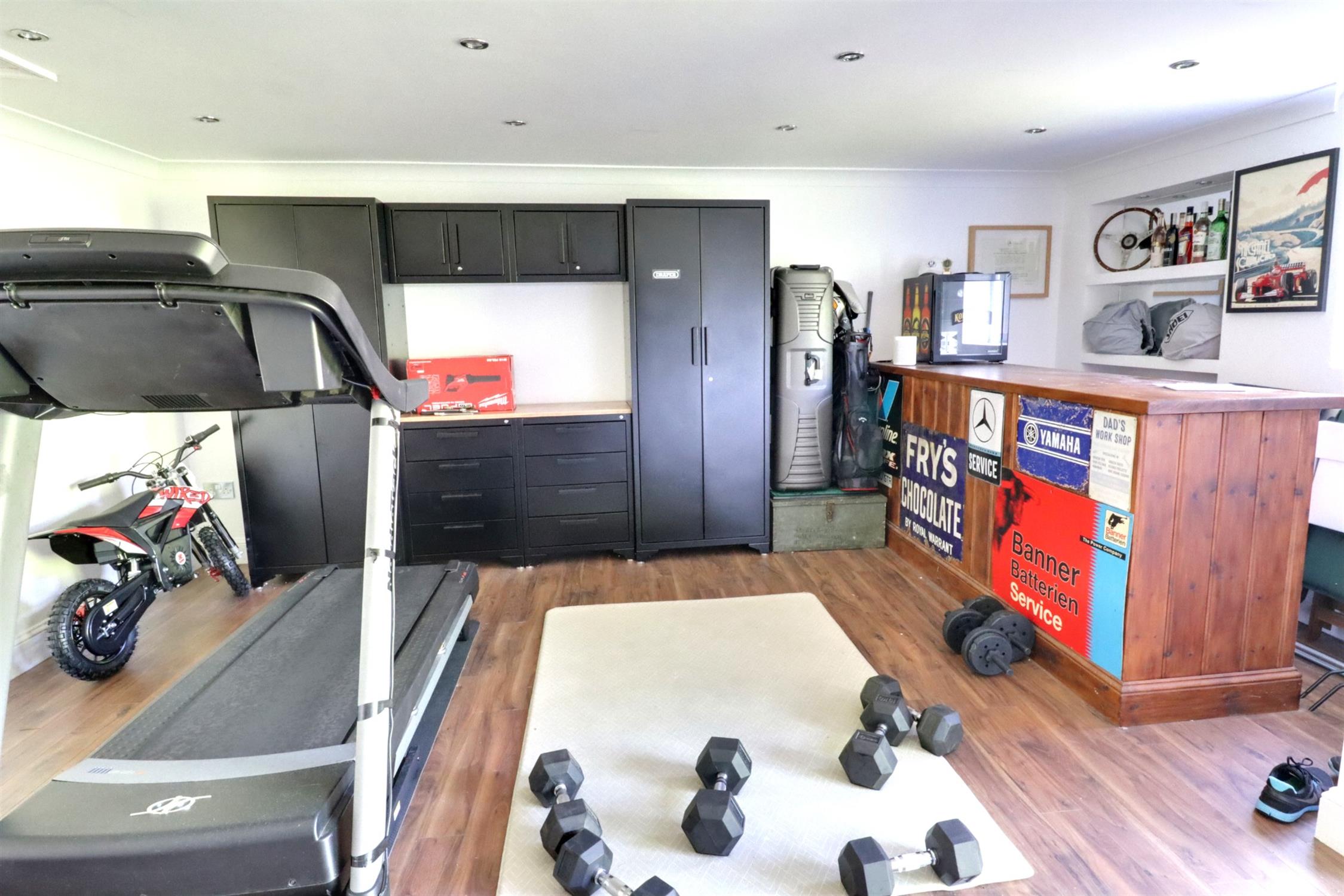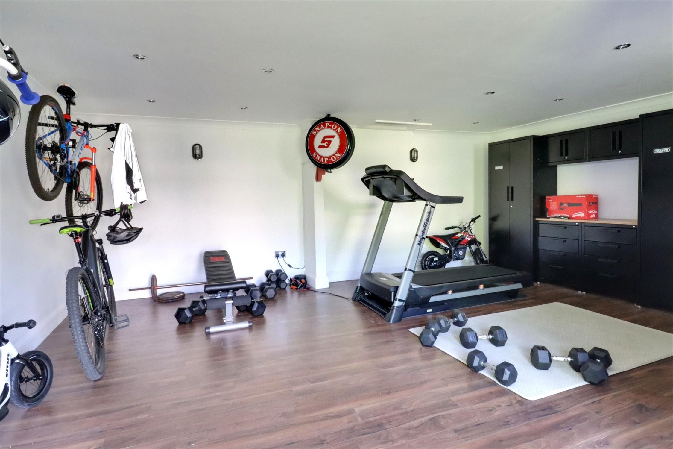 Measuring 19’x 18’, currently used as a gym, with insulated and plastered walls, light and power, bar, front aspect double glazed double doors, front aspect double glazed window, loft storage.