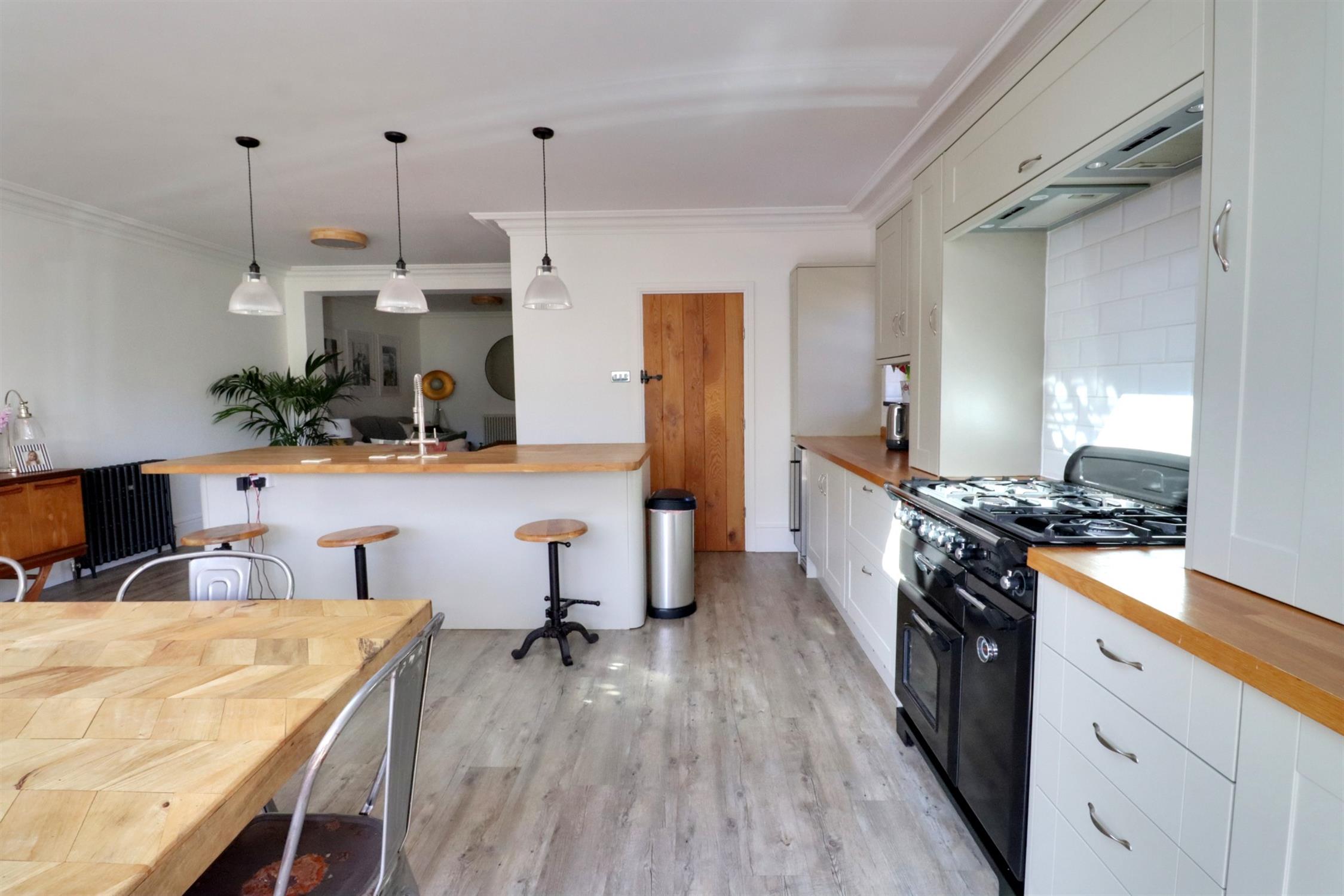 Kitchen/dining area - Fitted with a comprehensive range of matching wall and base units with solid wood worksurfaces over, gas range cooker with extractor hood over, wine cooler, central island with breakfast bar and solid worksurfaces, inset butler sink and integral dishwasher, two period radiators, ornate coving, Karndean flooring, two rear and one side aspect double glazed sash windows, rear aspect double glazed bi-folding doors leading to the rear garden, double glazed roof lantern, door to the utility room.