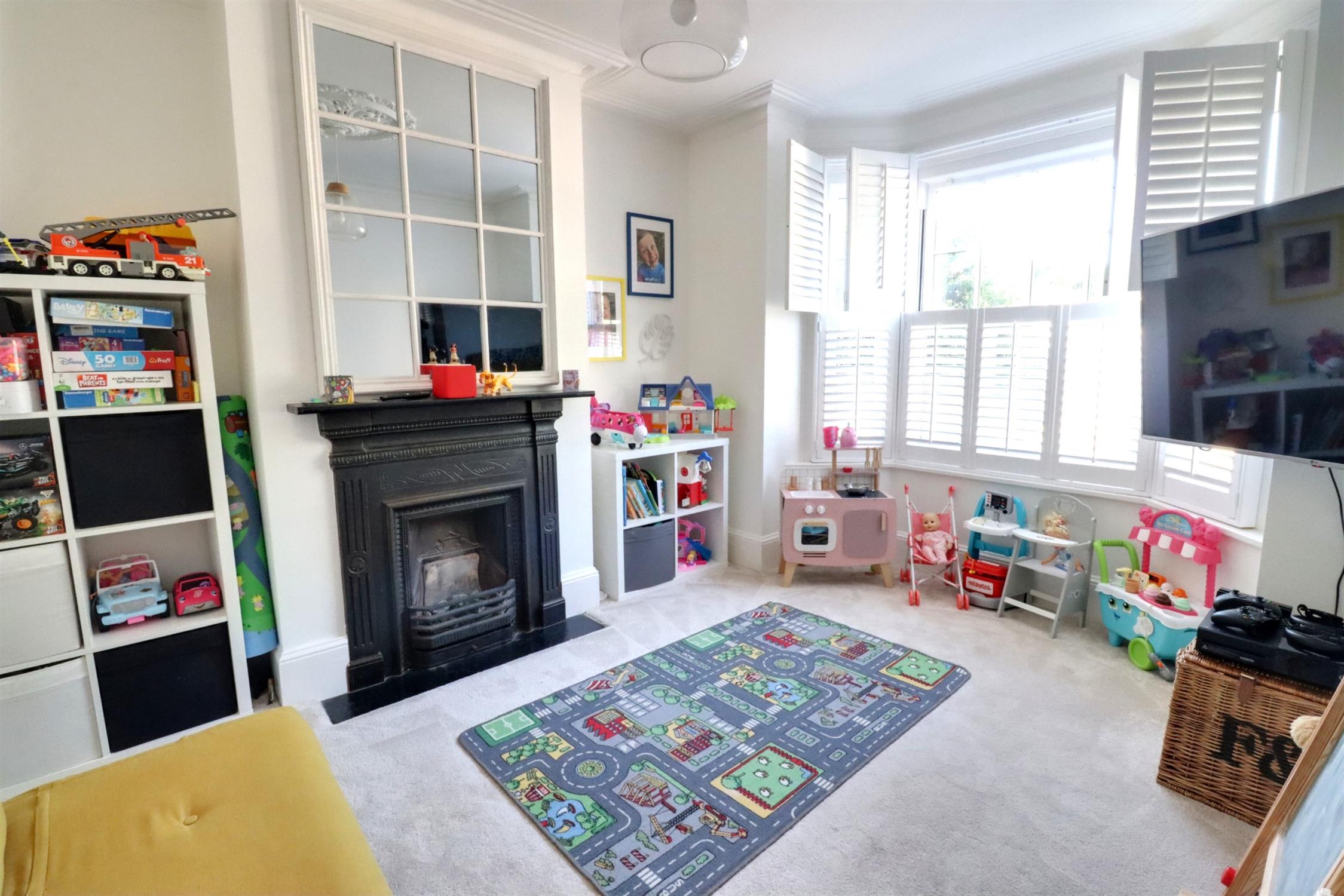 Character fireplace with open fire, ceiling rose with ornate coving, period radiator, front aspect double glazed sash bay window with shutters.