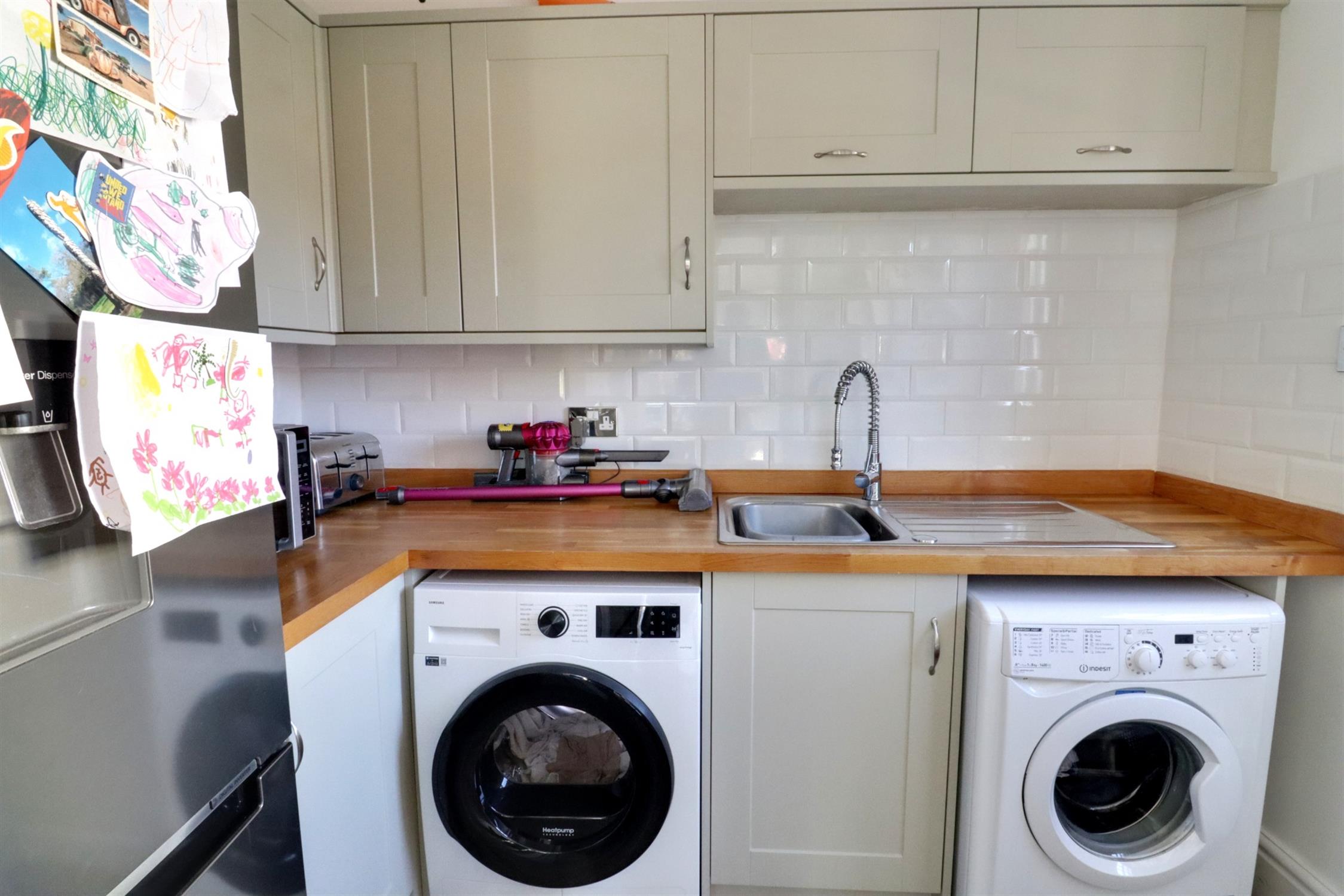 Wall and base units with solid wood worksurfaces over, stainless steel sink and drainer, spaces for washing machine, tumble dryer and fridge/freezer, Karndean flooring, ornate coving, side aspect double glazed stable door.