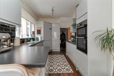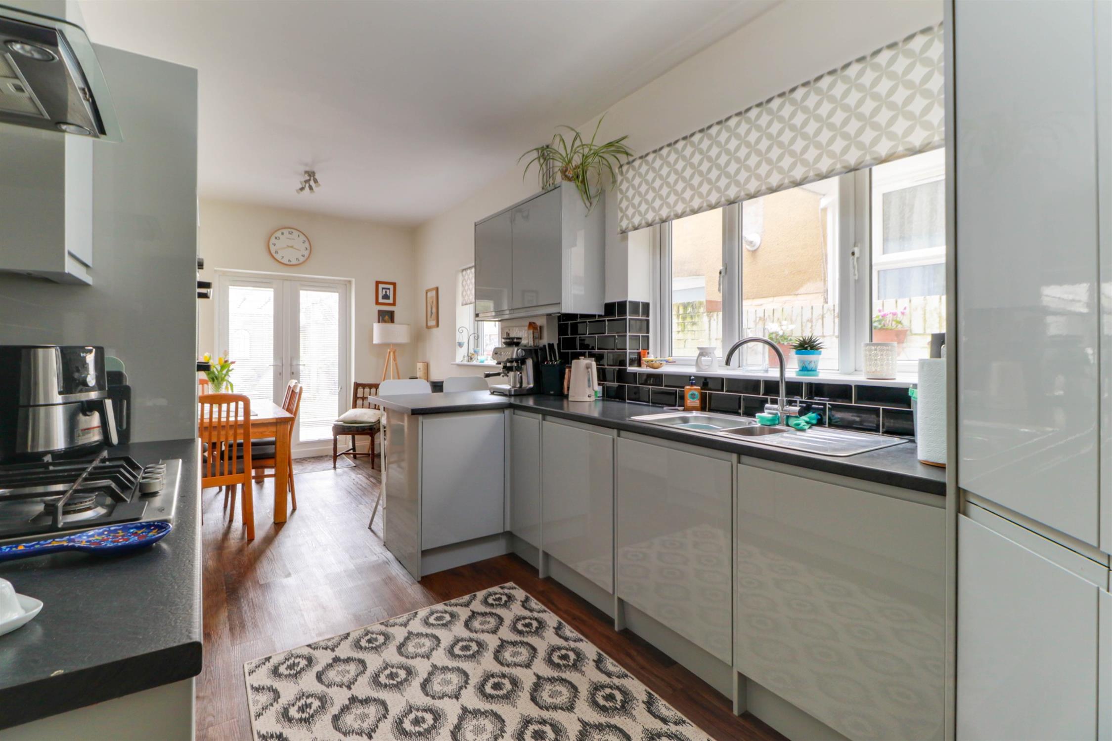 Two double glazed windows to side aspect, double glazed double doors onto rear garden, radiator, range of wall and base mounted units with work surfaces over, inset stainless steel sink and drainer with mixer tap over, integrated appliances including high level electric oven, gas hob with extractor over, fridge freezer, dishwasher, and washing machine, corner pantry cupboard, breakfast bar, laminate flooring.