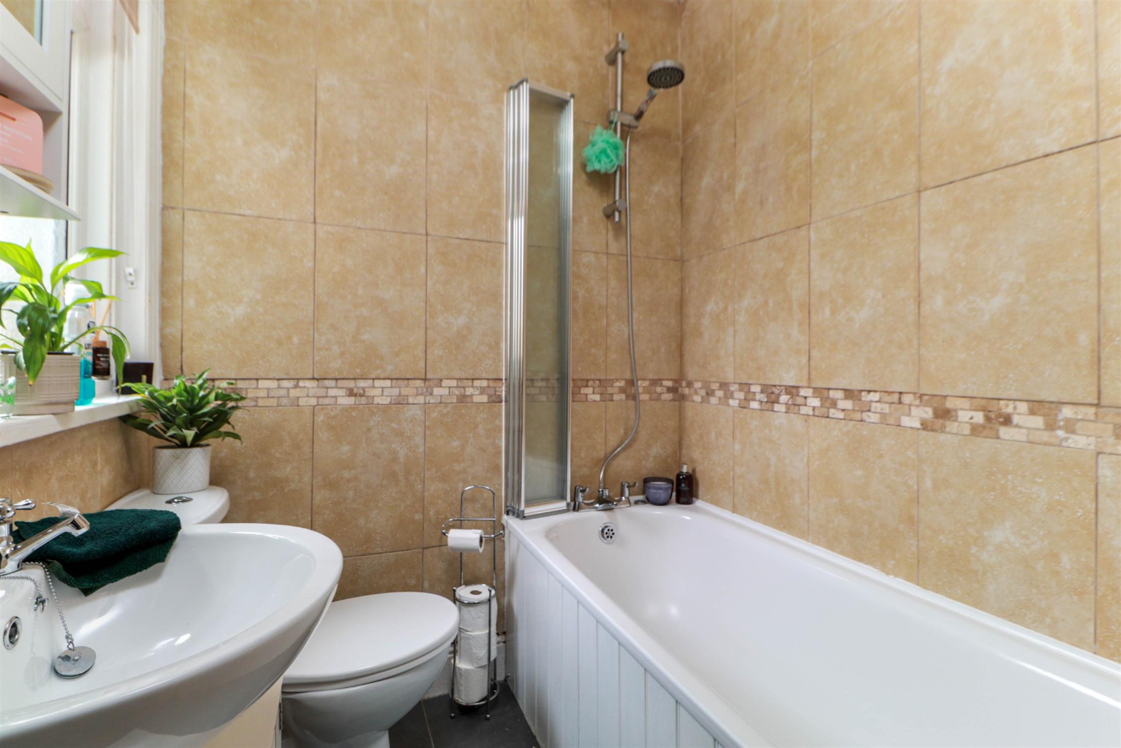 Extractor fan, double glazed obscured window, panelled bath, WC, pedestal wash hand basin, tiled walls, tiled floor.