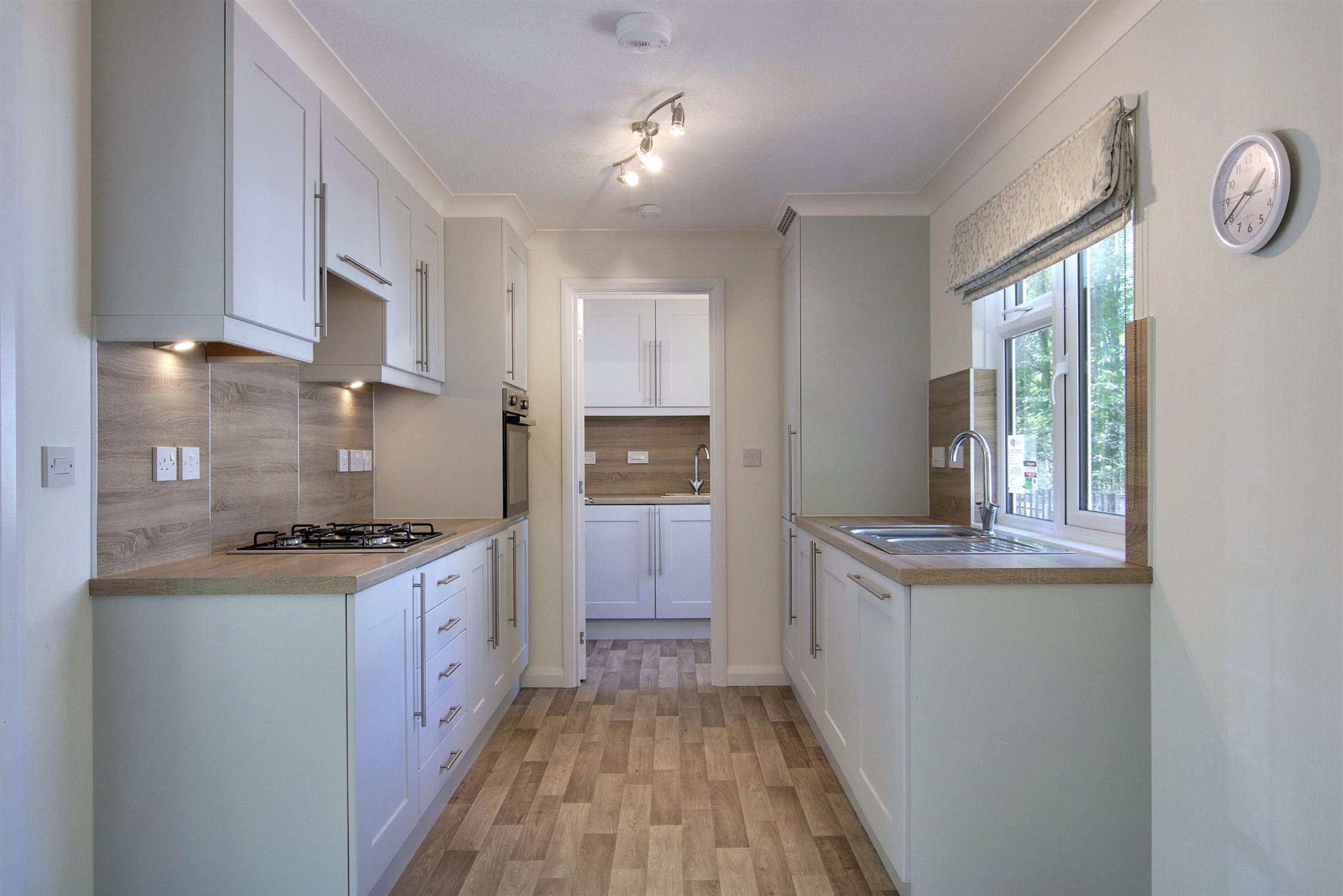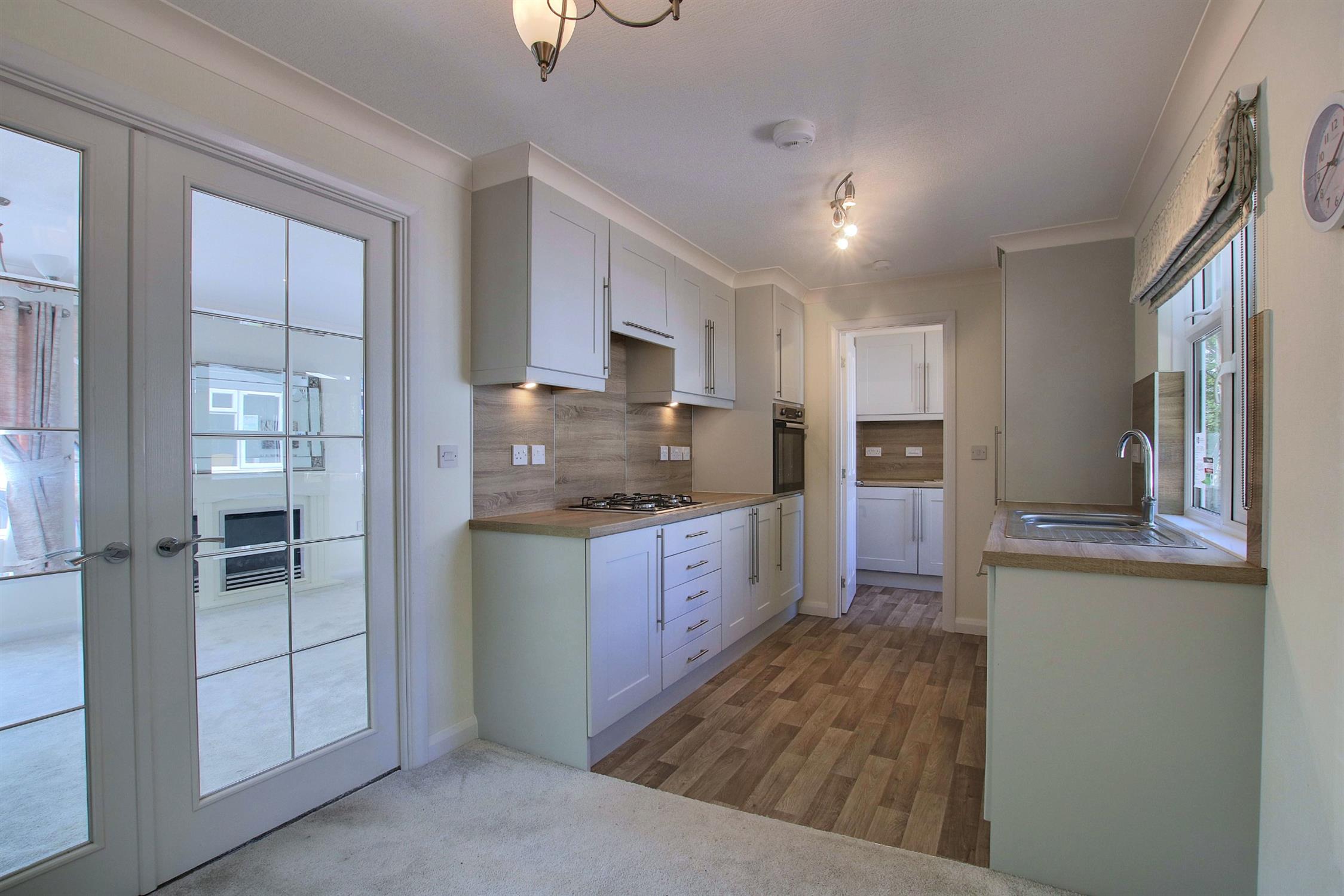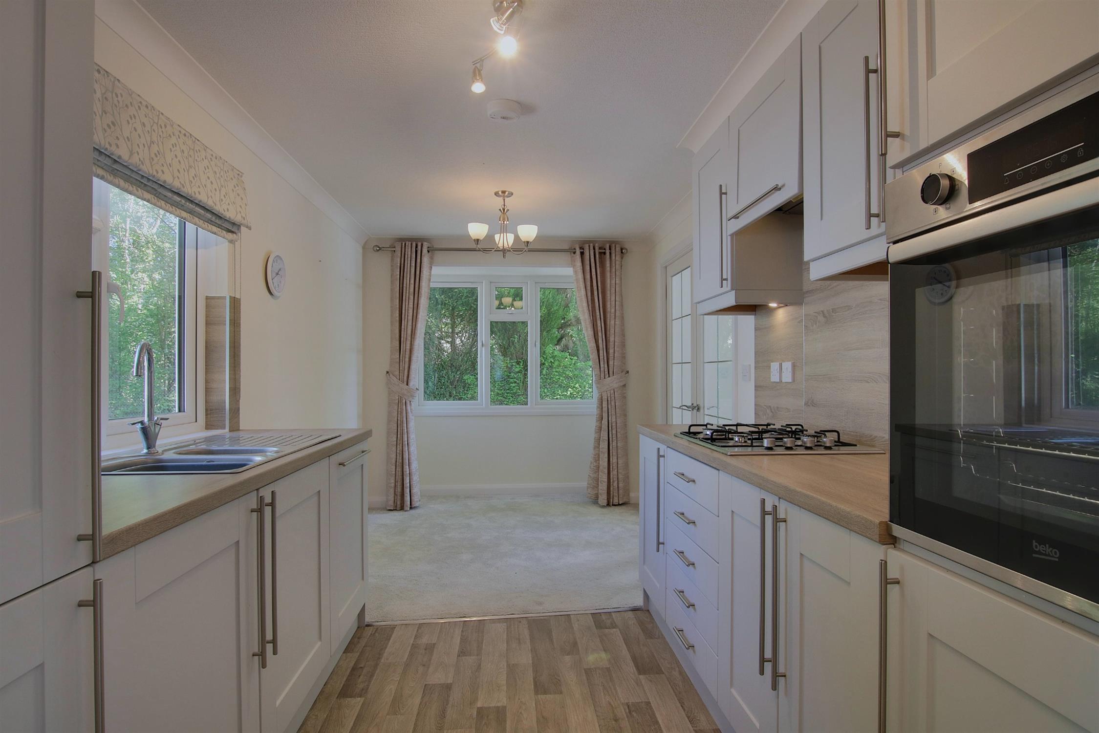 Beautifully fitted with a stylish range of modern wall and base units with complementary worktops, and equipped with a range of integrated appliances to include 4-ring gas (Calor) hob, electric oven, dishwasher and fridge/freezer, one-and-a-half bowl stainless steel sink with mixer tap, bay window. Door to: