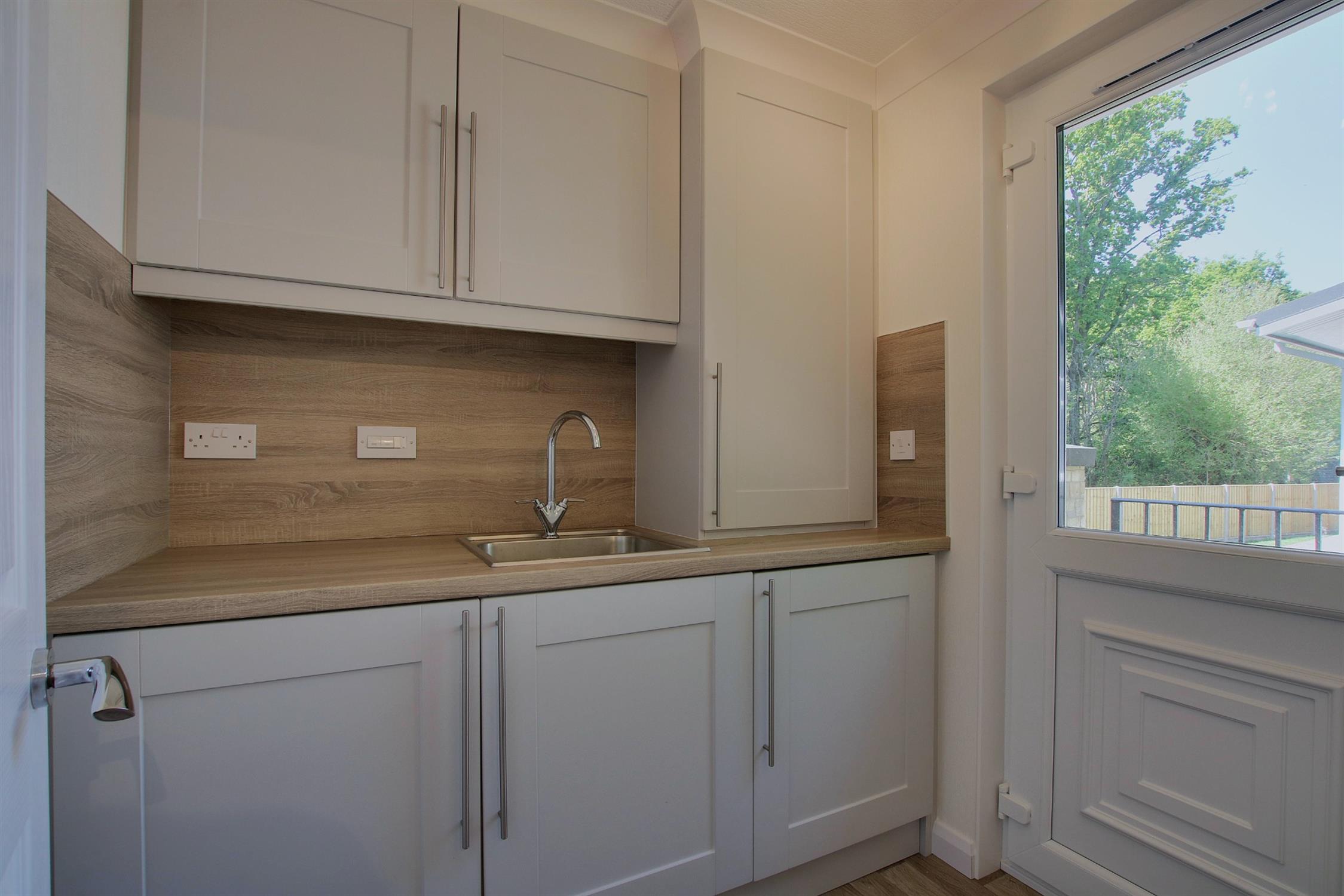 Fitted units to match the kitchen, inset stainless steel sink, integrated washing machine and tumble drier, cupboard housing the gas (Calor) central heating boiler, built-in larder cupboard, door to the outside.